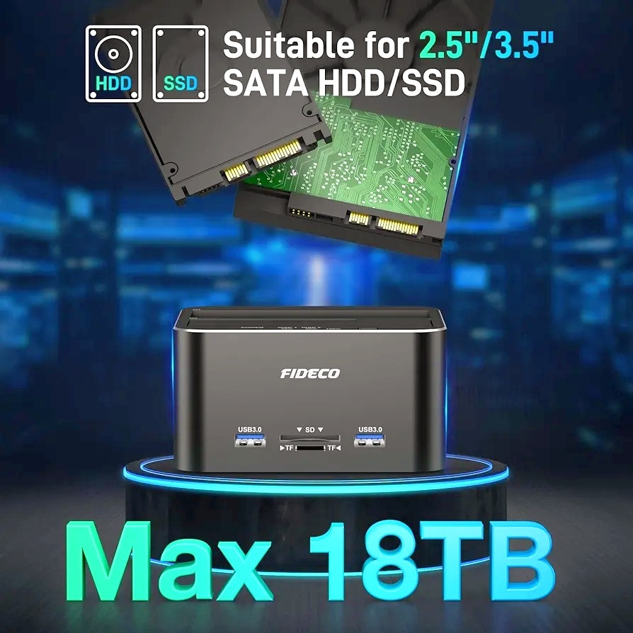 داک هارد دیسک FIDECO به طور گسترده با هارد دیسک/اساسدیهای SATA 2.5 و 3.5 اینچی سازگار است. لطفاً توجه داشته باشید که از هارد دیسک IDE پشتیبانی نمیکند.