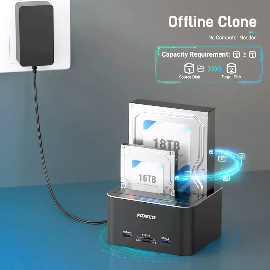 کلون آفلاین ایستگاه داکینگ FIDECO میتواند از کلونینگ آفلاین پشتیبانی کند. به هیچ کامپیوتری نیاز نیست! کافیست دیسک منبع را در اسلات 1 و دیسک هدف را در اسلات 2 قرار دهید. لطفاً توجه داشته باشید که ظرفیت هارد دیسک هدف باید برابر یا بیشتر از هارد دیسک منبع باشد.