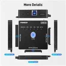 سازگاری گسترده آداپتور IDE و SATA فیدکو میتواند از هارد دیسکهای SATA یا IDE 2.5 یا 3.5 اینچی پشتیبانی کند. این آداپتور میتواند از اتصال همزمان 2 هارد دیسک برای انتقال داده پشتیبانی کند - IDE Source+SATA2 Target؛ SATA1
