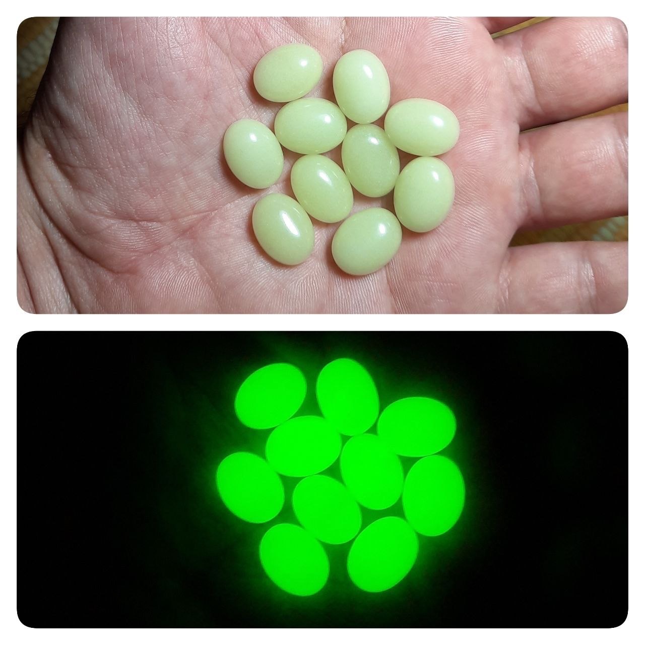 مجموعه 10 عددی گوهر شب چراغ نورانی با تلالو سبز خوشرنگ و بازتاب نور عالی (جذب نور در محیط روشن و بازتاب نور در تاریکی ، هر مقدار نگین در فاصله کمتر و زمان بیشتر در معرض نور مستقیم و قوی باشد بیشتر شارژ شده و در تاریکی پرنور تر خواهد بود ) ، سایز 10 × 12 میلیمتر
