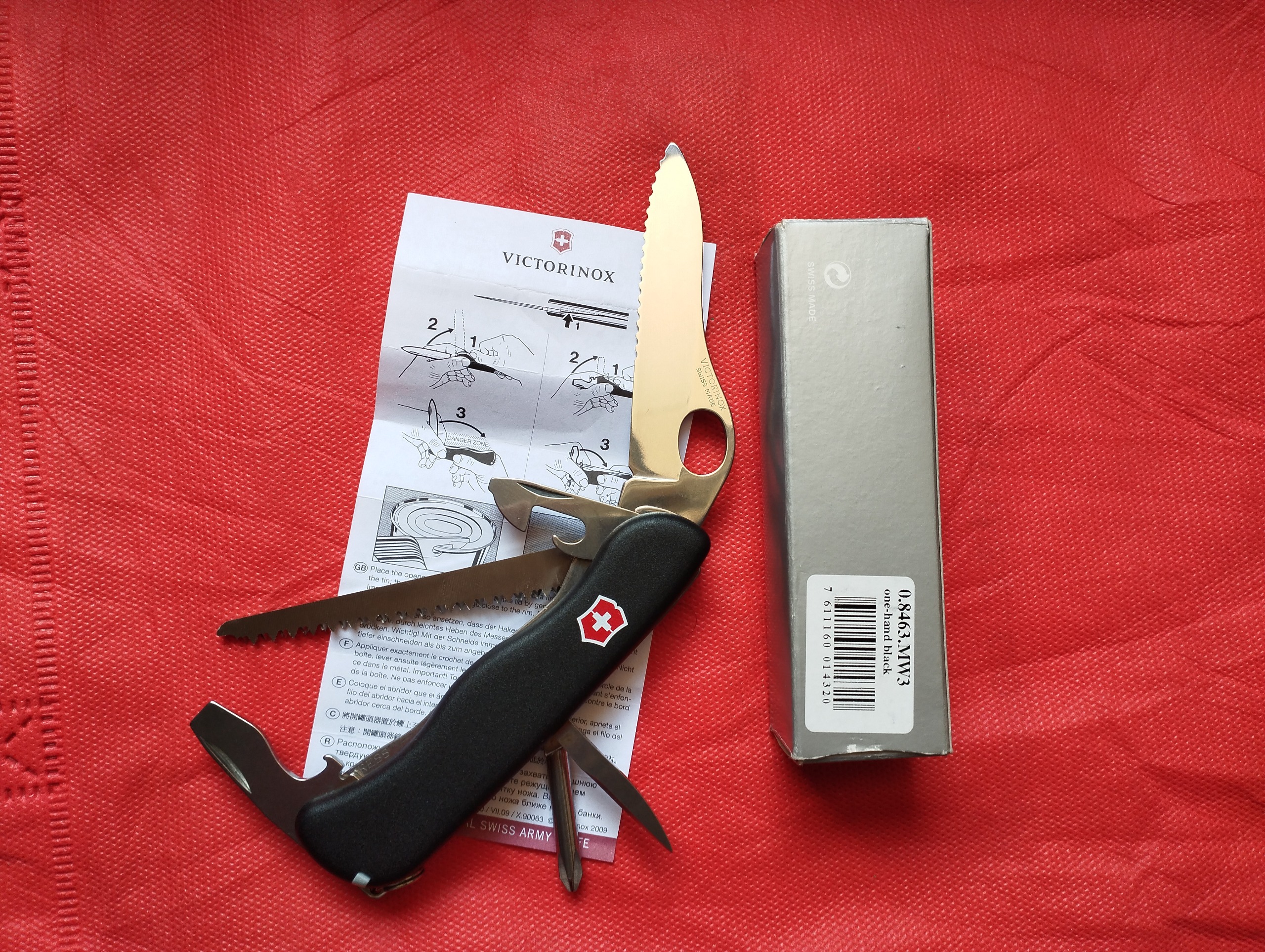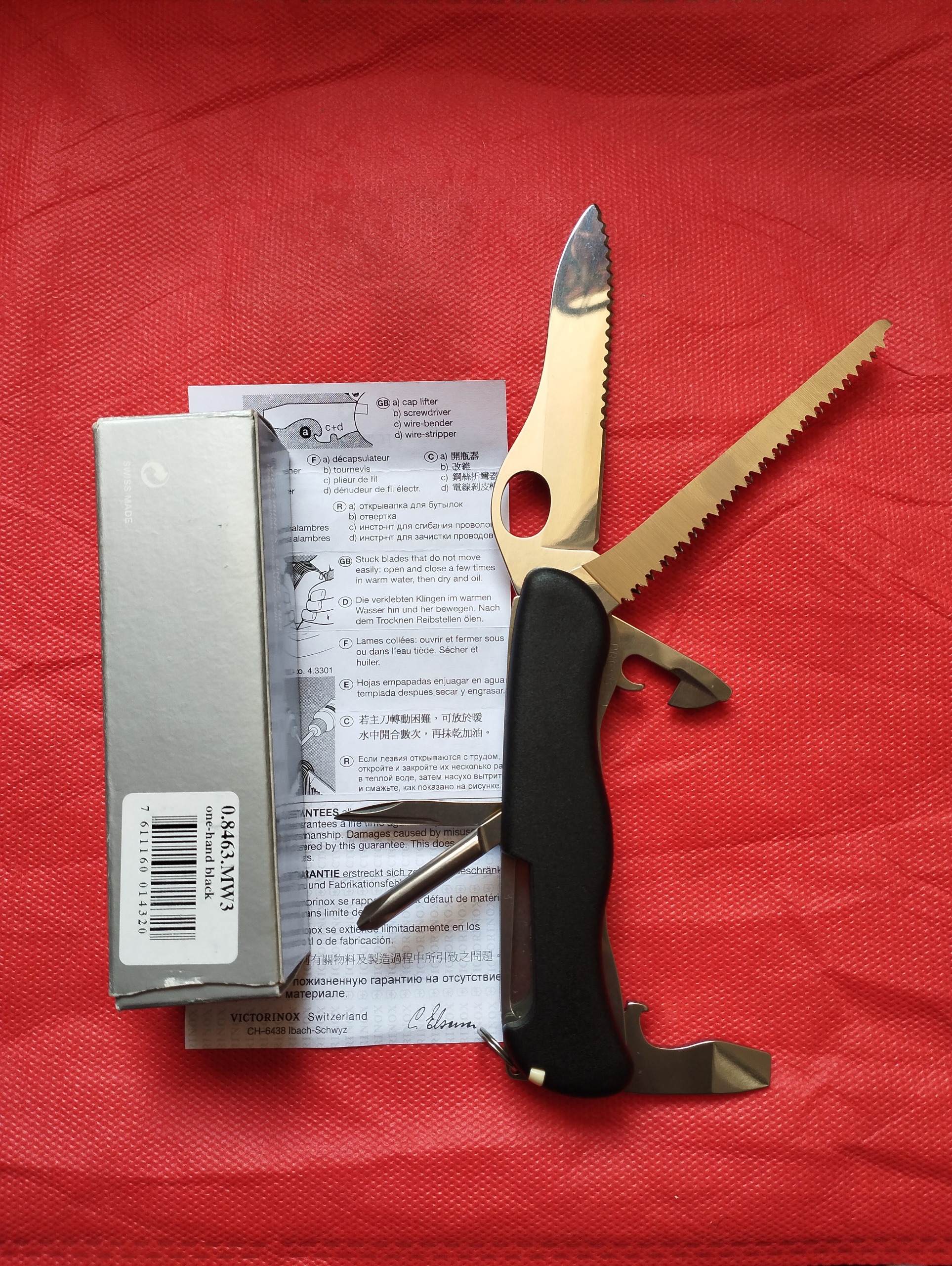 چاقوی چند کاره برند مشهور سوییسی ویکتورینوکس  (چاقو پیچ گوشتی تخت ریز پیچ گوشتی تخت بزرگ پیچ گوشتی چهار سو اره دو نوع قوطی بازکن یه تیغه درفش مانند موچین و خلال دندان هم داره )طول تیغه چاقو و راه 9 سانتی  می باشد مدل8463MW3 نو نو مطابق تصاویر گذاشته شده همراه کارتن فابریک و کاتالوگ آن