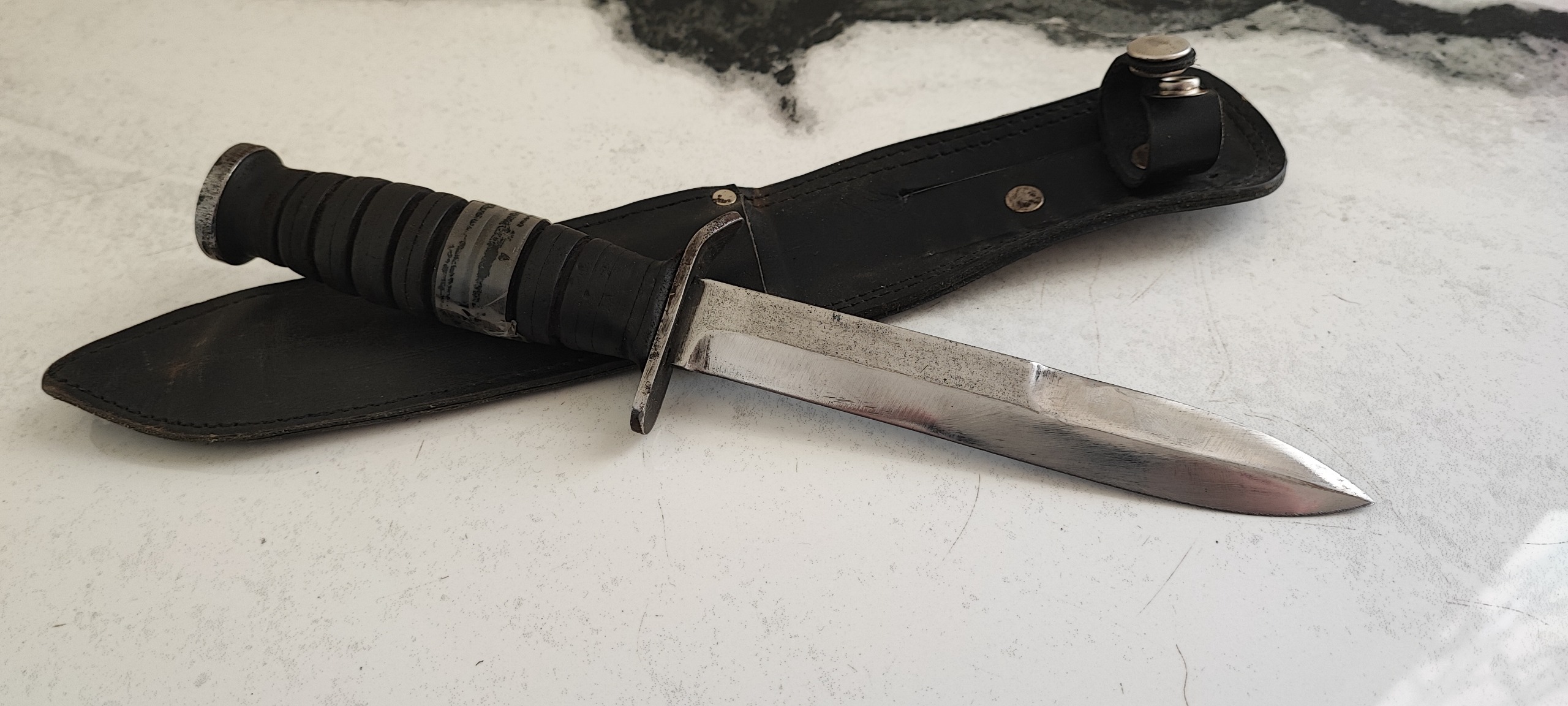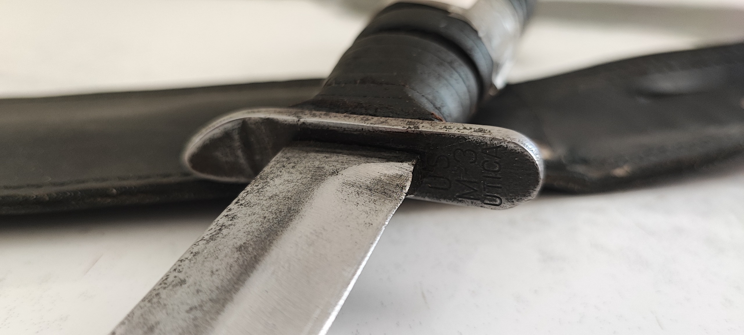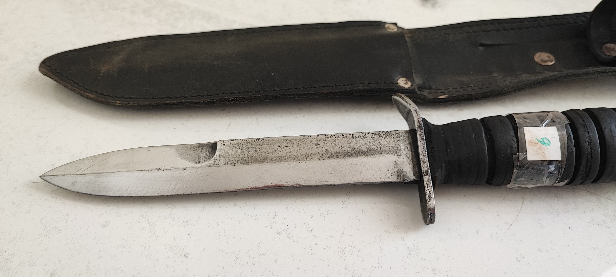 28 سانت طول، دسته و غلاف چرمی، تیغ فولادی، دقیقاً یک سانت از نوک تیغه کوتاه شده، کمیاب و کلکسیونی