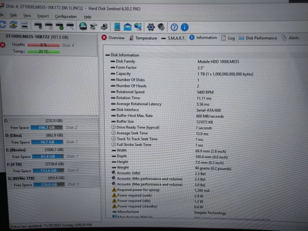 هارد یک ترابایت لپ تاپی سیگیت سلامت 9%