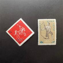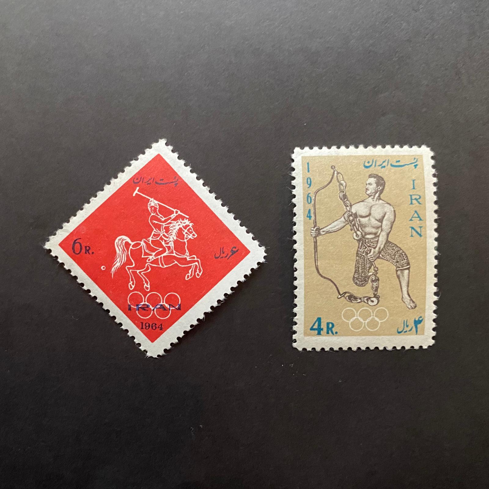 2 عدد تمبر سری المپیک توکیو، چاپ 1343 دارای 60 سال قدمت، کیفیت در حد نو مطابق تصویر، پشتشون در اثر گذشت زمان زرد شده