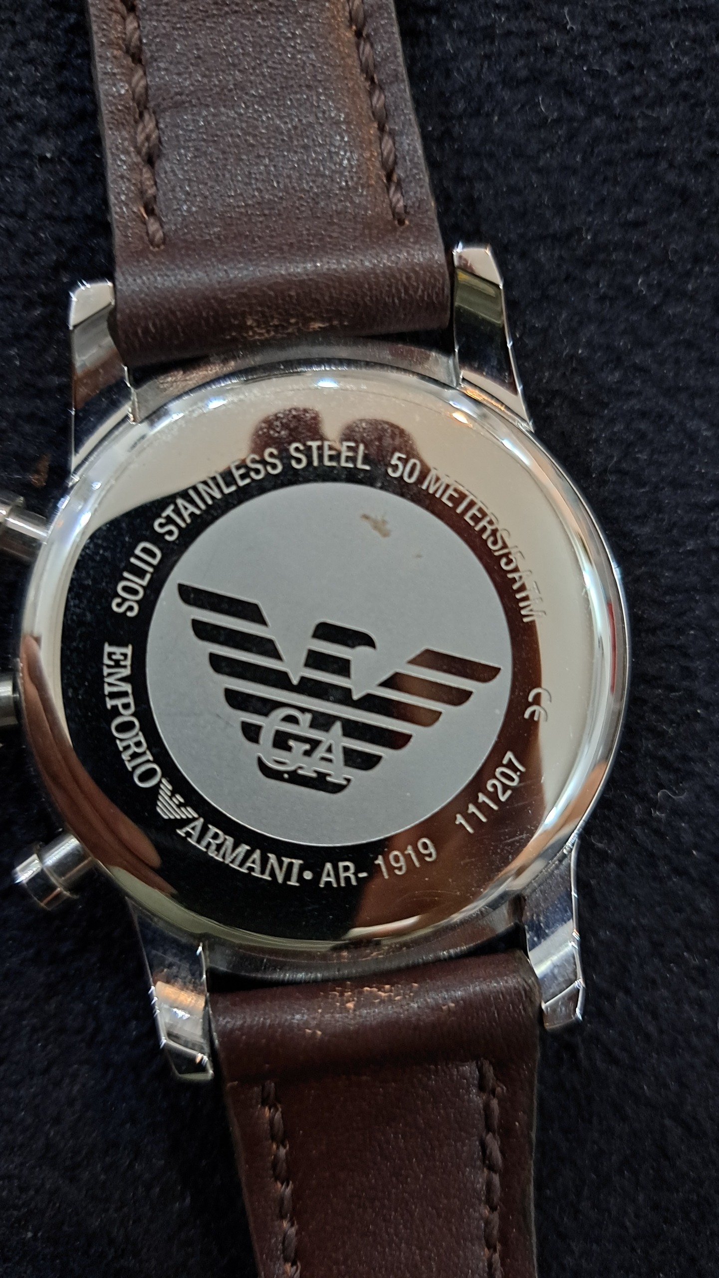 ساعت امپریو آرمانی AR 1919 از مدلهای کمیاب در ایران است،ساعت نوی نو و بدون ذره ای مشکل است.قیمت شروع مزایده یک سوم قیمت روز ساعت است و قیمت هم بسیار پایین تر از قیمت روز ساعت تعیین شده است