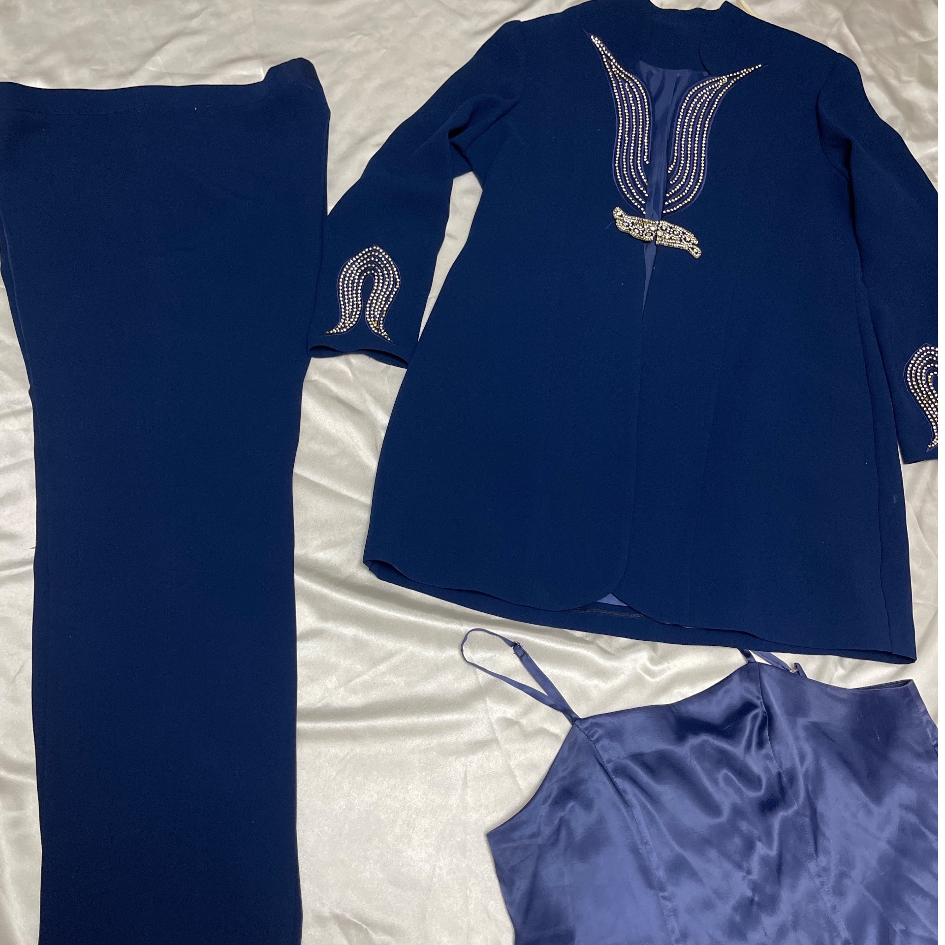 کت شلوار جواهر دوزی جنس کرپ عرض سینه 54 قد کت 90 قد شلوار 110 دور کمر شلوار105 همراه با تاپ ساتن قد تاپ 56 عرض سینه تاپ 47 بغل زیپ.کاملا سالم و بدون ایراد