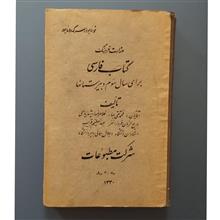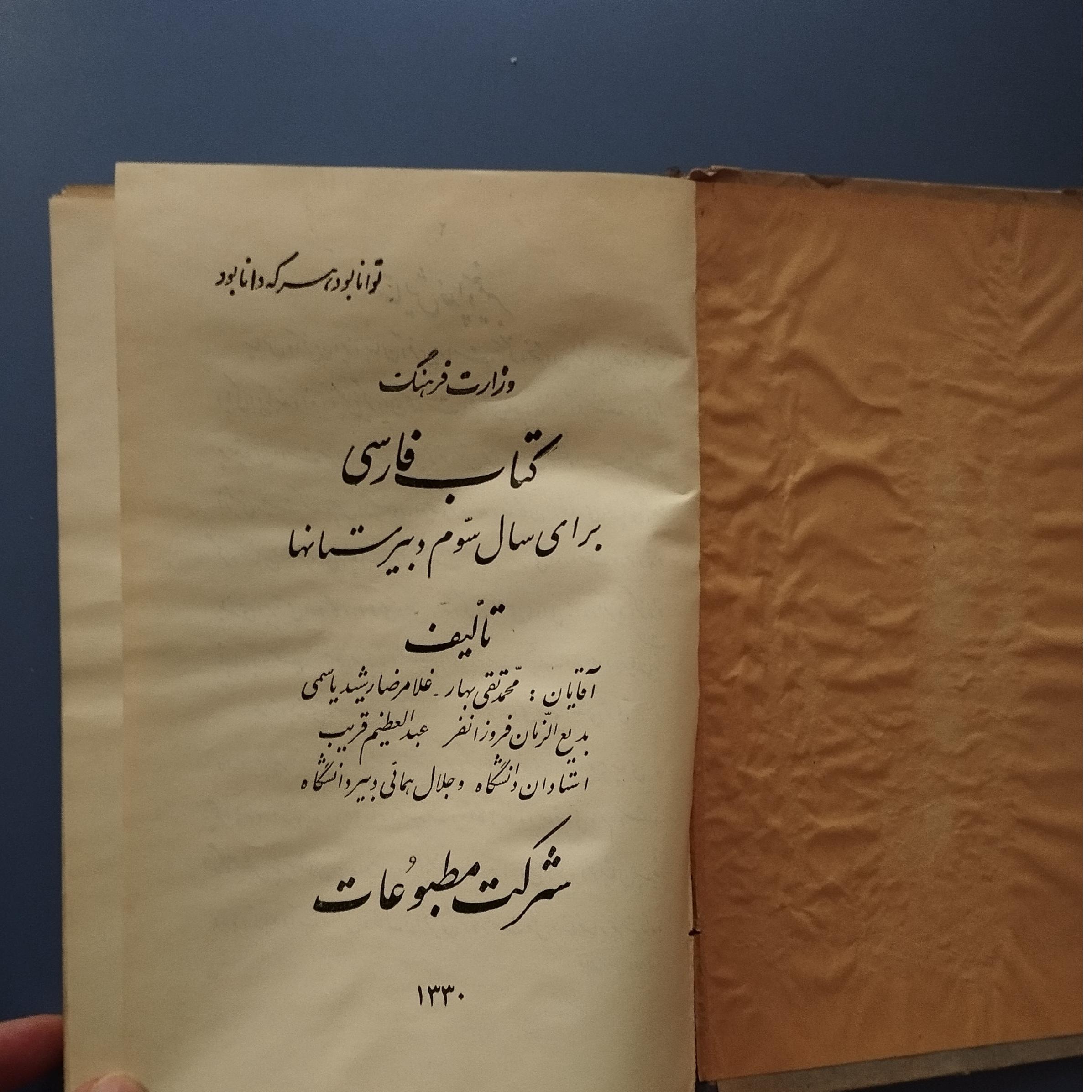 کتاب فارسی سوم دبیرستان 1330 . مألفان این کتاب جزو مفاخر فرهنگی و ادبی ایران هستن. از نظر کلکسیونی بسیار خاص و با کیفیت هستش. جلد و صفحات بدون پارگی. خط خطی و نوشته ندارد. فقط مطابق تصویر گوشه عطف پارچه ای کمی پارگی دارد. اندازه رقعی و 288 صفحه کامل. لطفاً قبل از انتخاب هر سوال یا تصویری از کتاب خواستید پیام بدین چون بخاطر کیفیت و امکان اسکن از صفحات این کتاب مرجوعی ندارد. ملاک را تصاویر قرار دهید