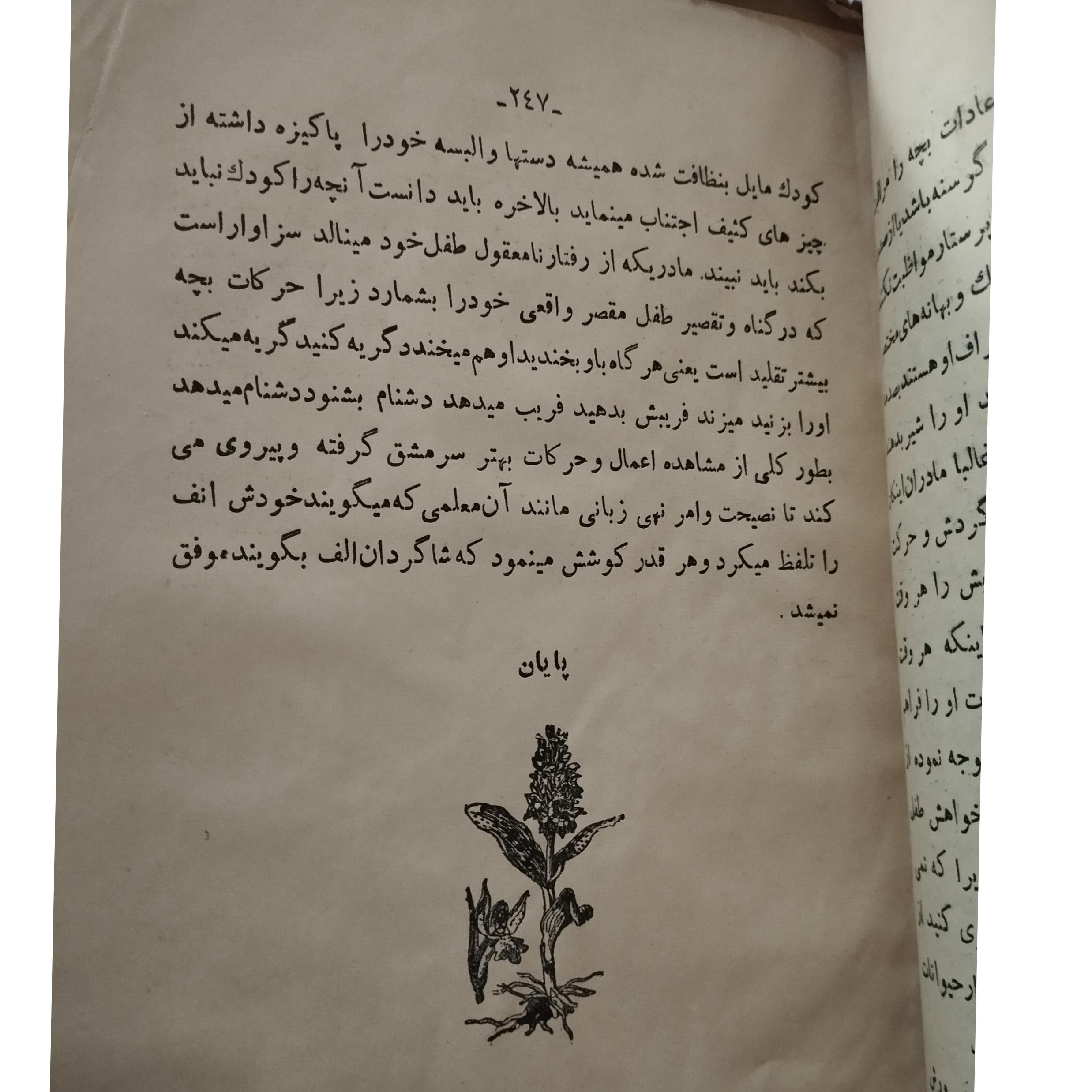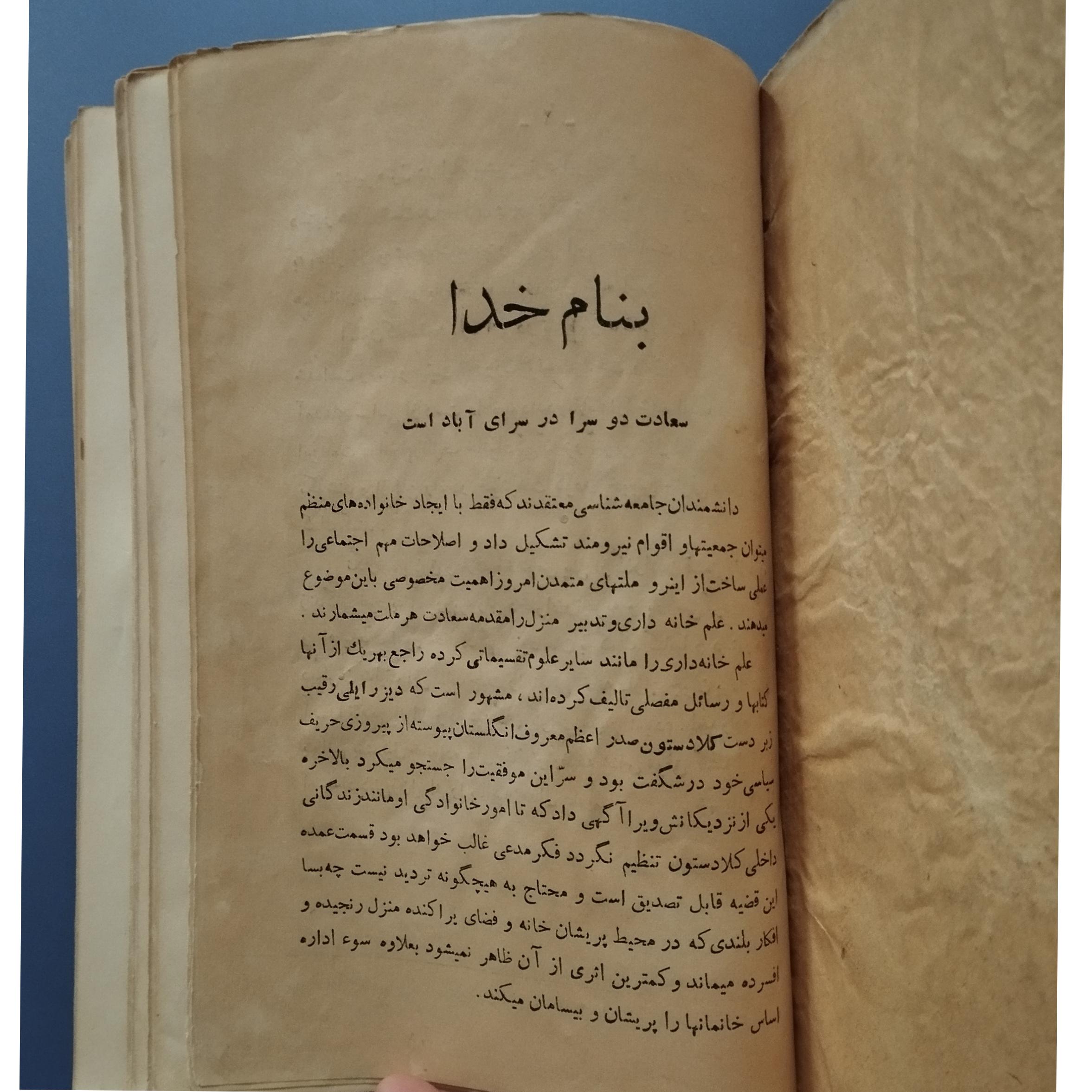 کتاب بسیار نایاب تدبیر منزل تألیف بدرالملوک بامداد تاریخ 1327. صفحه اول را ندارد که خالی در محتوی ایجاد نمی کنند. دو الی سه صفحه لکه و زردی دارد ولی بقیه صفحات بسیار تمیز و بدون نوشته هستن. اندازه رقعی و عطف پارچه ای سالم دارد. محتوای کتاب در مورد نحوه خانه داری و مدیریت منزل مخصوص دختران دانش آموز است. لطفاً قبل از انتخاب هر سوال و یا تصویر بیشتر از کتاب را خواستید پیام دهید. بخاطر کلکسیونی و نایاب بودن کتاب و امکان عکس برداری و یا اسکن صفحات این کالا مرجوعی ندارد.