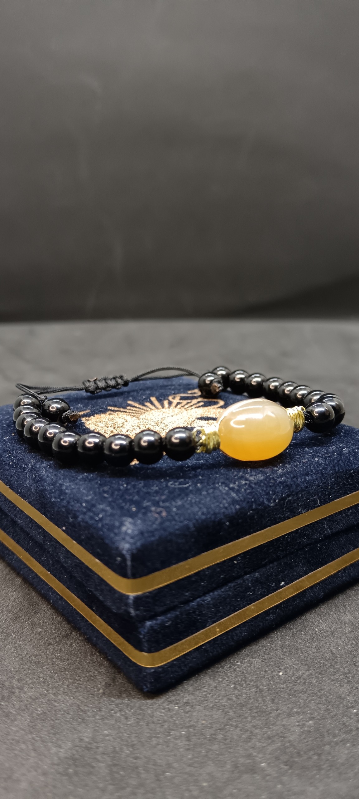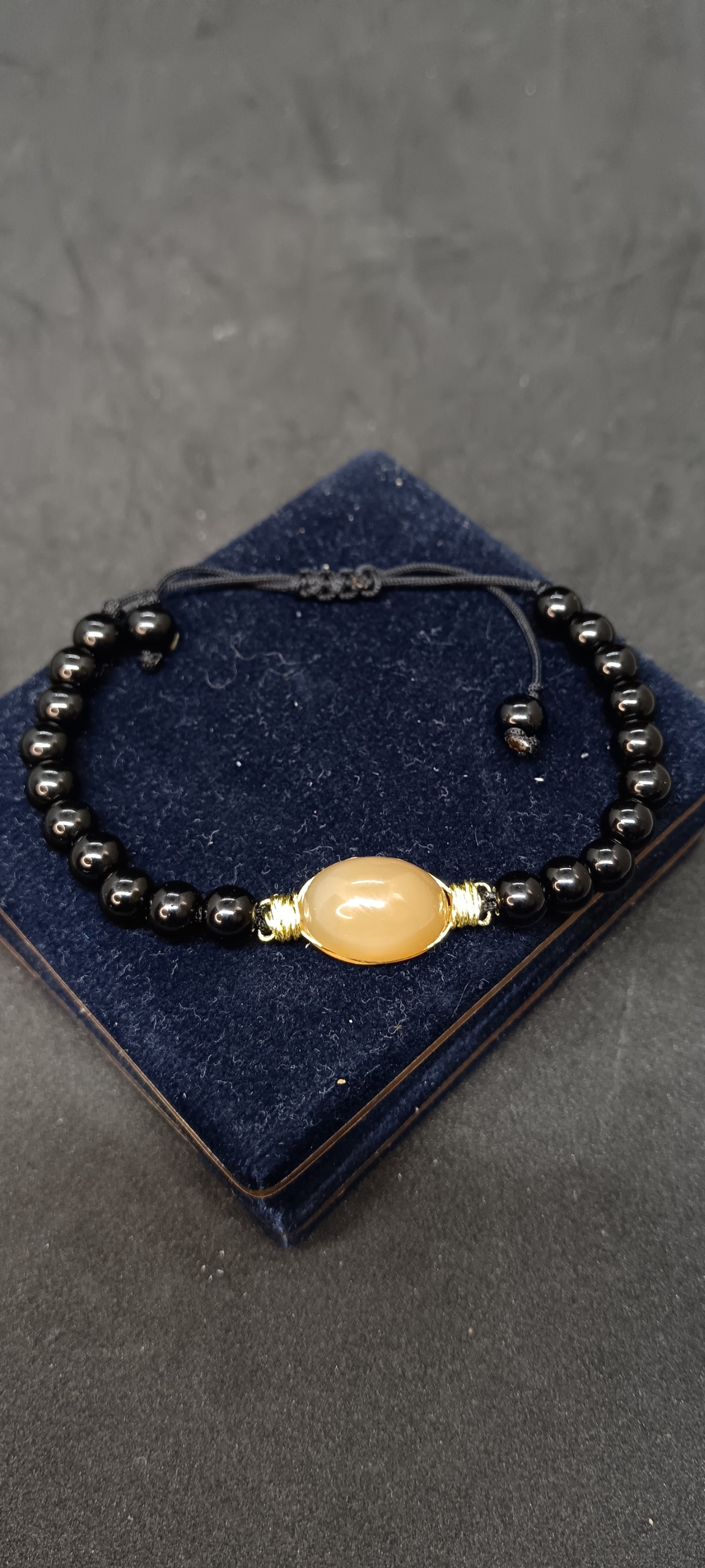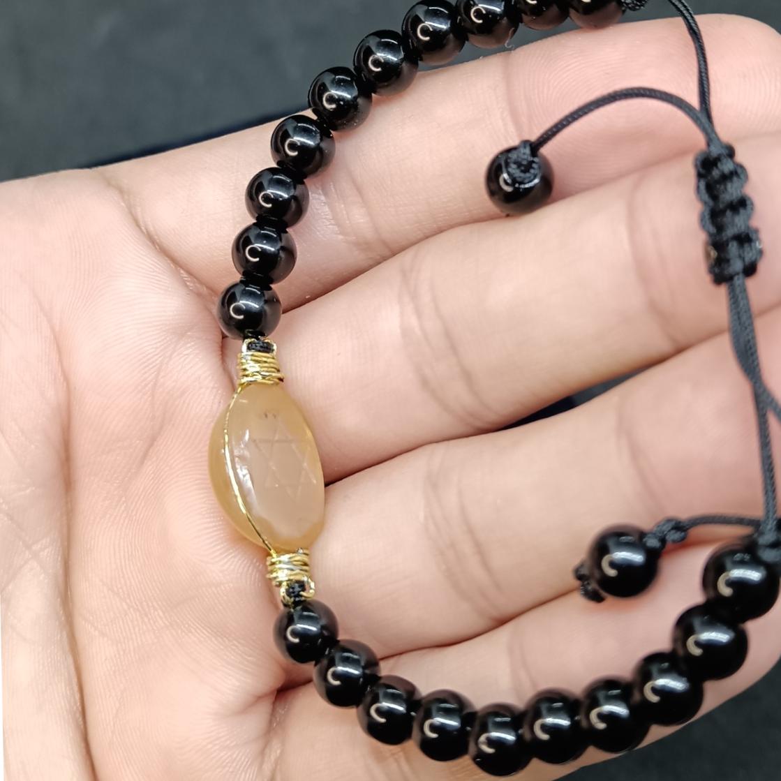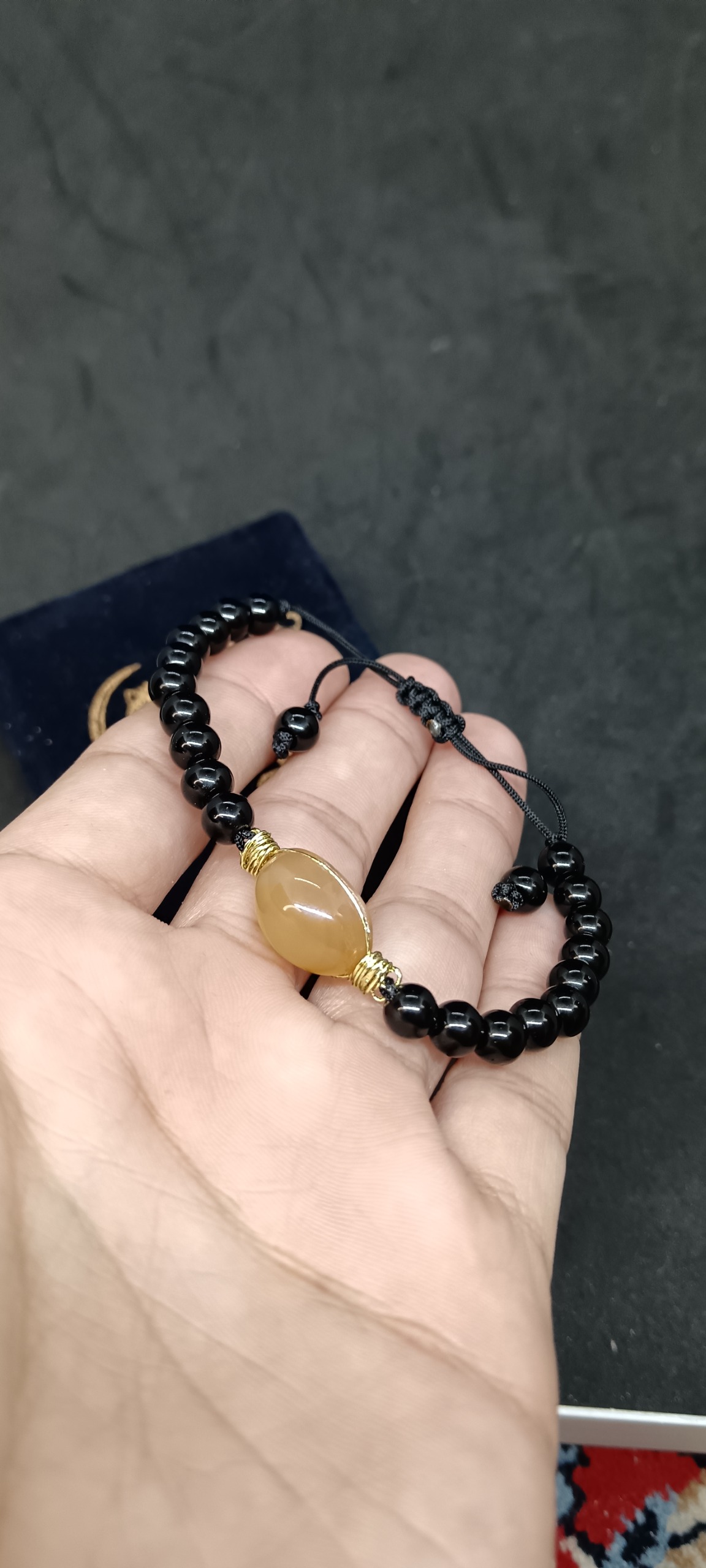 دستبند مهره بافت مزین به سنگ عقیق زرد عسلی طبیعی تراش دامله کهنه ( سنگ و تراش مربوط به چنددهه قبله) پشت سنگ حکاکی طرح ستاره نماد شانس
