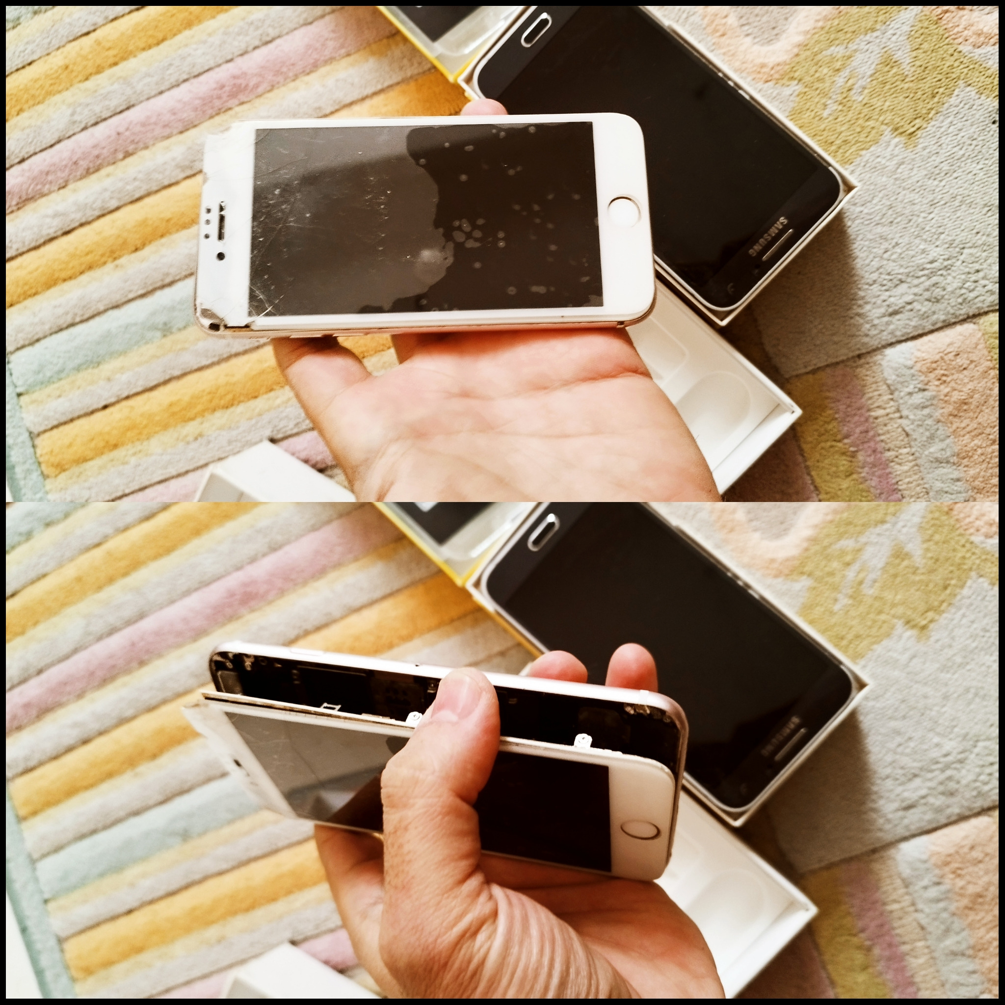 دوتا گوشی با کارتن یکی آیفون 6s اپل رنگ رزگلد esamیکی دیگه سامسونگ e25 رنگ مشکی esamهردو نیاز به تعمیر دارند.esamقیمتی که گزاشتم پول طلای توشون هم نیست که بکار رفته.esamشارژر و هندزفری ندارند.