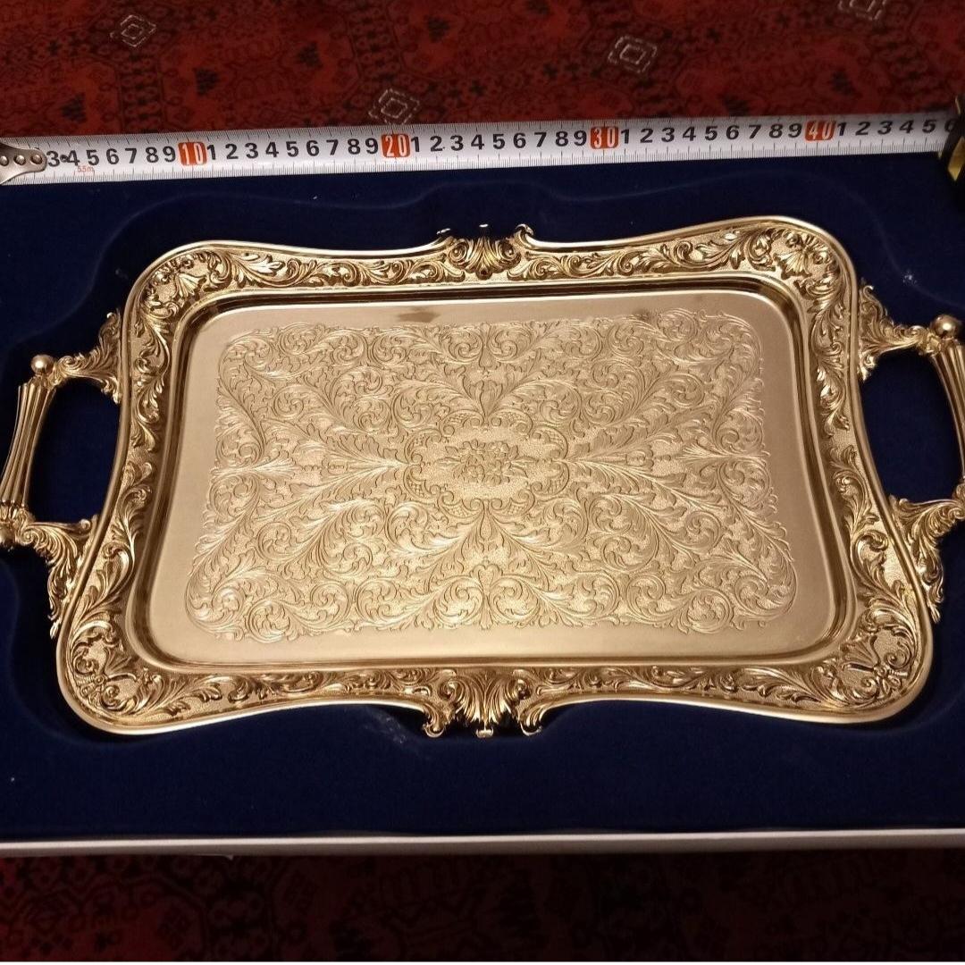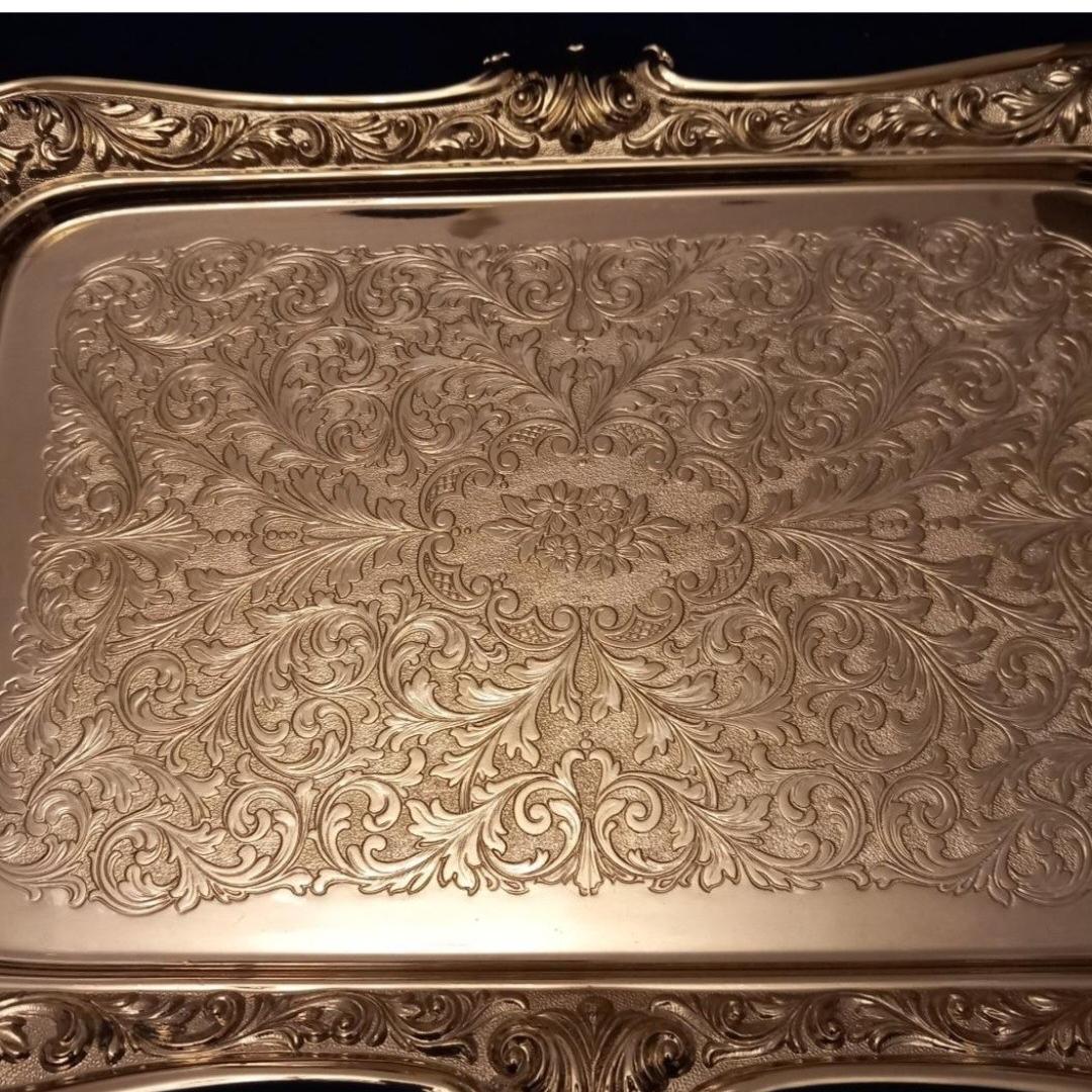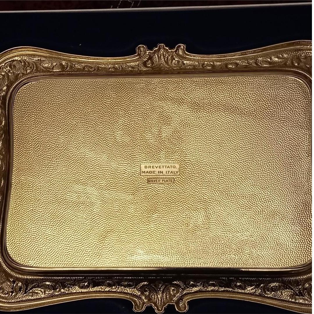 سینی سیلورپلیت ایتالیایی/ برند معروف، قدیمی و بسیار کمیاب BREVETTATO/ نقره عیار پایین ایتالیا/ یک کار خاص و آنتیک/ حتی در آنتیک فروشی های تهرون هم به سختی میتوان چنین کارهای آنتیکی را بصورت نو و بدون استفاده پیدا کرد آنهم با جعبه فابریک خودش/ کلا سالهای سال از داخل جعبه در نیامده/ در داخل تصاویر متر گذاشته شده تا ابعاد و اندازه مشخص باشد/