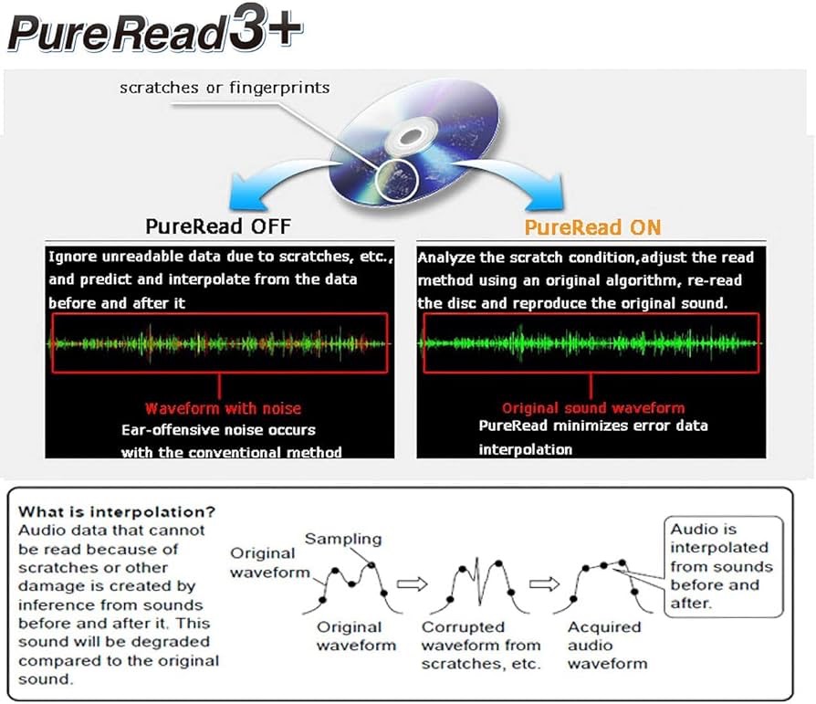 تجربه موسیقی بهتر به لطف PureRead 3+ با الگوریتمهای منحصر به فرد اگر هنگام وارد کردن سیدیهای صوتی، خطاهای خواندن به دلیل خراش یا اثر انگشت رخ دهد، این ویژگی امکان تشخیص خودکار وضعیت دیسک، تنظیم روش خواندن با استفاده از یک الگوریتم خاص و خواندن مجدد دیسک را فراهم میکند. این امر تداخل دادههای خطا را به حداقل میرساند. *اگر دیسکها یا بخشهایی از دیسکها خیلی آسیب دیده باشند، قابل پخش نیستند. سازگار با نوشتن پرسرعت M DISC برای بایگانی طولانی مدت دادهها: این محصول با رسانههای نوری M-DISC برای بایگانی سازگار است که توسط US Millenniata Inc. توسعه داده شده است. اکنون از نوشتن 6x روی M-DISC (BD) SL و M-DISC (DVD) نیز پشتیبانی میکند.