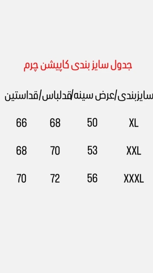 کاپشن چرم زرشکی رنگ جنس عالی و ضد باد و برای فصل سرما عالی هست و ضد آب و مقاومت عالی و دوخت عالی دارای دوام بالا و انعطاف پذیری بالا هست و برلی مراسم و روزمره عالی هست و کار جوری طراحی شده که هم برای اندازه ایکس لارج اندازه هست و برای 2 ایکس لارج هم اندازه هست و به هر سه سایز میخورد و کامل زیرش لباس گرم هم بپوشی کامل زیپ بسته میشه و مناسب هر سه سایز ایکس لارج 2 ایکس لارج و 3 ایکس لارج اندازه هست چون تفاوت اندازه آنها با هم زیاد نیست و مناسب سه سایز میباشد و کارهای دیگر ما هم دیدن فرمایید ما درخدمتتون هستیم ...