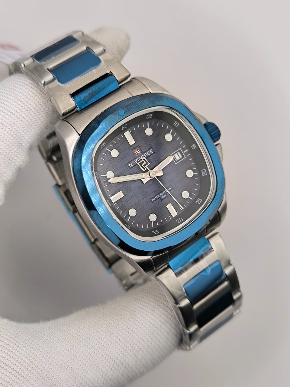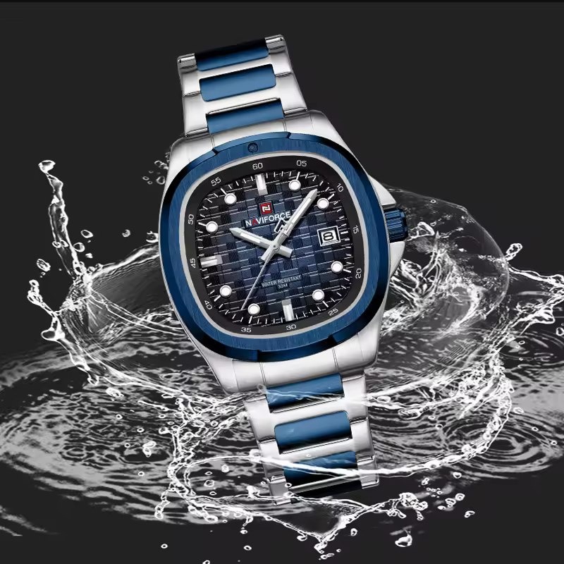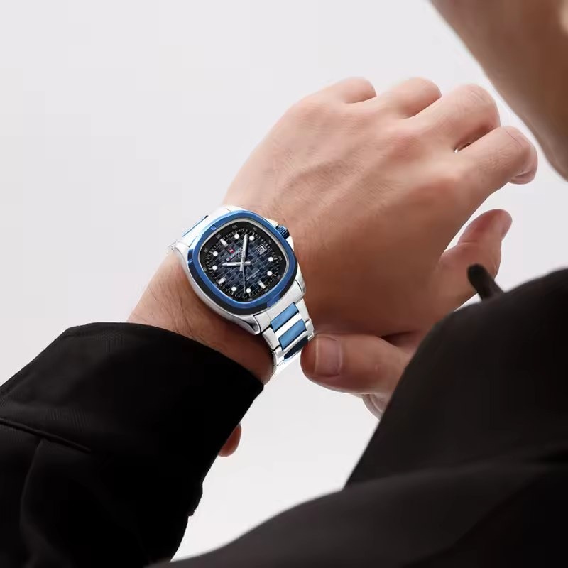 ساعت مچی عقربهای مردانه نیوی فورس مدل Nf9240 با فرم صفحه مربع طرح پتک و طراحی خاص انتخابی متفاوت برای استایلهای رسمی و روزمره است این مدل اورجینال همراه با جعبه و کارت گارانتی معتبر از فروشگاه اینترنتی روبی مد عرضه میشود دارای موتور ژاپنی دقیق تقویم روزشمار عقربههای شبنما و قاب استیل مقاوم است بند استیل توپُر با رنگ ثابت و ضد حساسیت پوستی در کنار قفل کلیپسی ضامندار راحتی و دوام را تضمین میکند همچنین شیشه معدنی ضد خش و مقاومت در برابر آب این ساعت را به گزینهای مطمئن و شیک برای آقایان خوشسلیقه تبدیل کرده است.