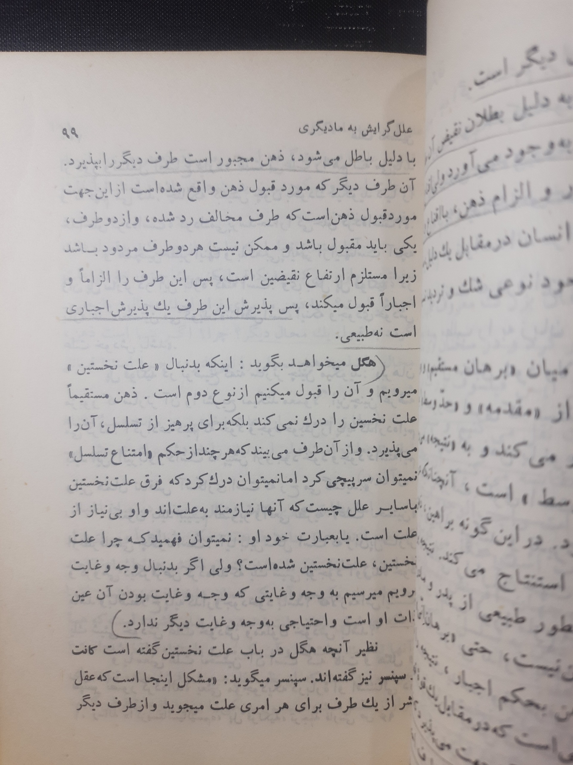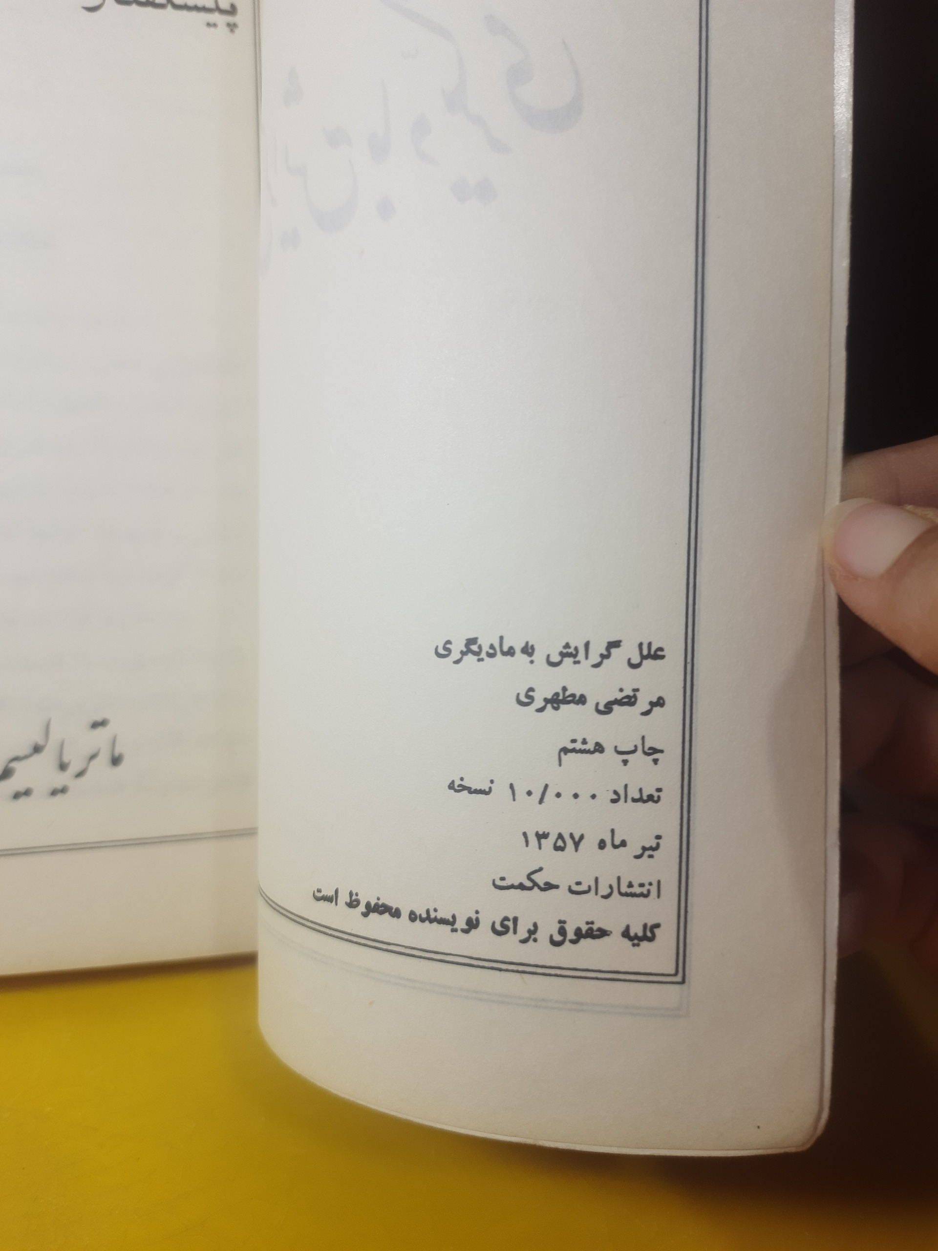 کتاب علل گرایش به مادیگری به ضمیمه ماتریالیسم در ایران از شهید مرتضی مطهری انتشارات صدرا چاپ سال 57 انتشارات حکمت در 257 صفحه/مقدمه این کتاب یکی از عوامل ترور شهید مطهری هست.