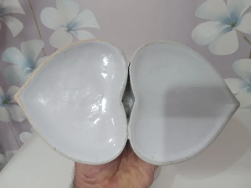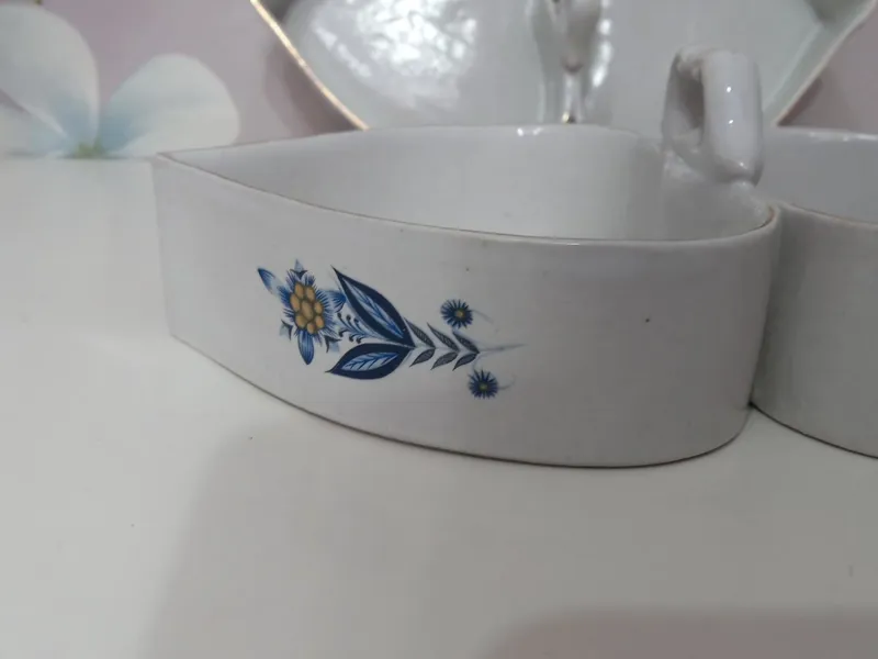 نقل خوری یا تنقلات خوری یا چاشنی خوری شکل دوتا قلب به طول 22 سانت و عرض 12 سانت.جنس چینی سرامیکی قدیمی با نقش گل آبی در طرفین ظرف.