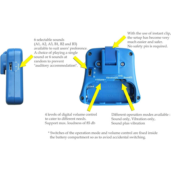 - این زنگ هشدار دارای قابلیت خاموش شدن دو مرحلهای است. هدف از این قابلیت این است که وقتی کودک رختخوابش را خیس میکند، مطمئن شود که باید بلند شود. روش صحیح متوقف کردن زنگ هشدار، باز کردن گیره حسگر و فشار دادن دکمه تنظیم مجدد است. همچنین میتوانید دکمه تنظیم