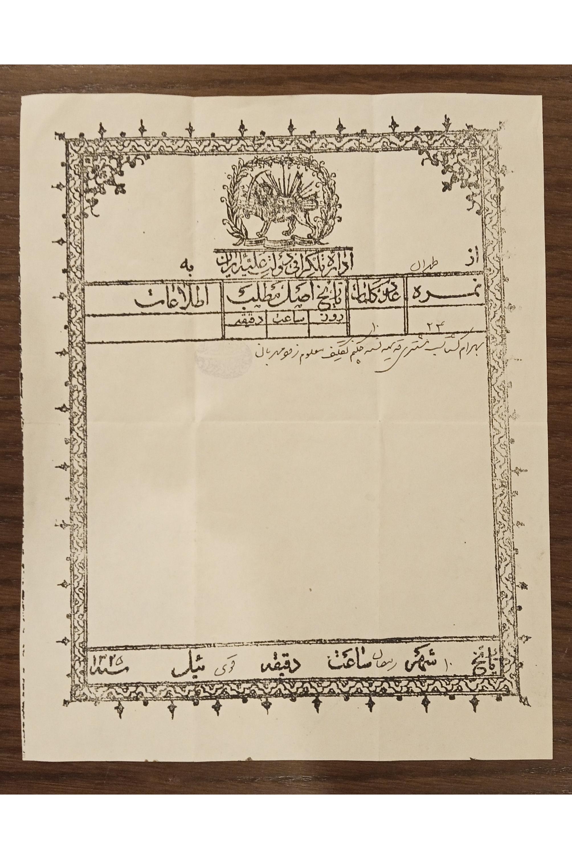 تلگراف طهران به یزد به همراه پاکت