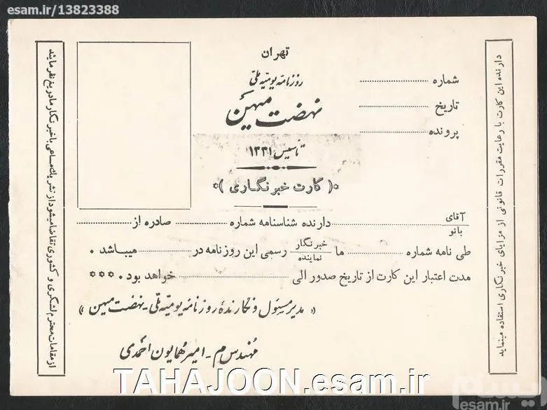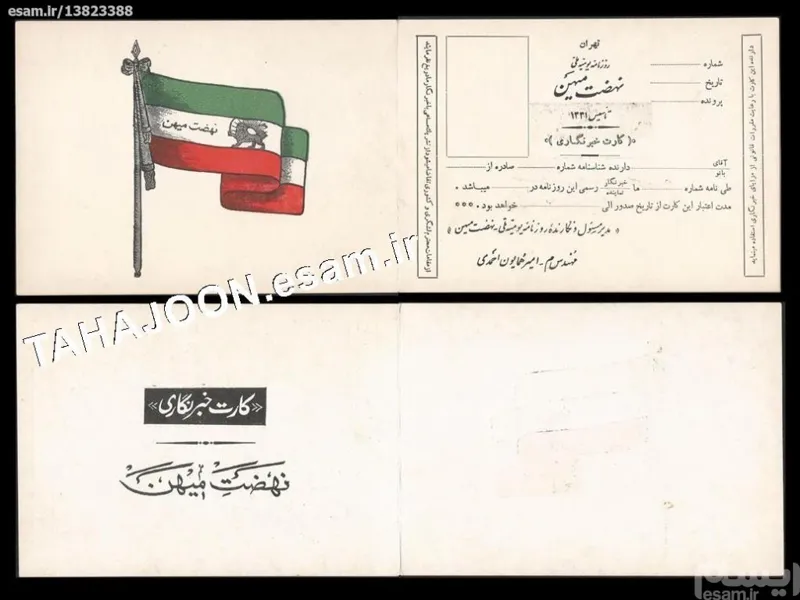 کارت خبرنگاری روزنامه یومیه ملی ، نهضت میهن - دوره محمدرضا شاه پهلوی (سال 1331)