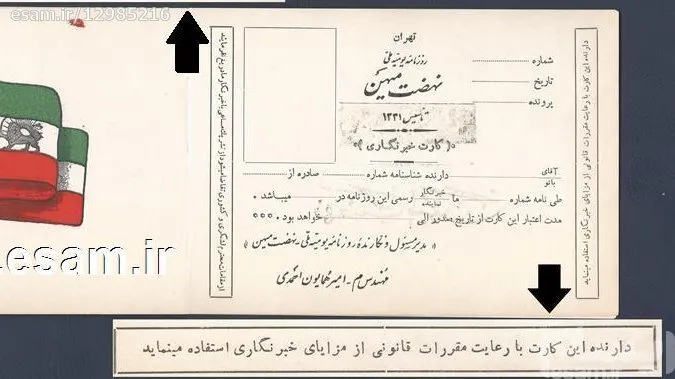 کارت خبرنگاری روزنامه یومیه ملی ، نهضت میهن - دوره محمدرضا شاه پهلوی (سال 1331)