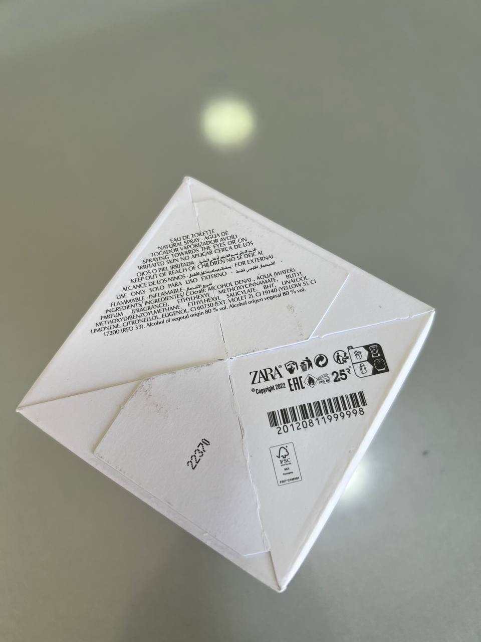 ساخت اسپانیا (Made in Spain): برند زارا یک برند اصیل اسپانیایی است. همانطور که در تصویر پشت جعبه مشاهده میکنید، عبارت Made in Spain با وضوح بالا حک شده است. تمامی مراحل فرمولاسیون و پر کردن این عطر در کارخانههای اصلی زارا در اروپا انجام شده است.