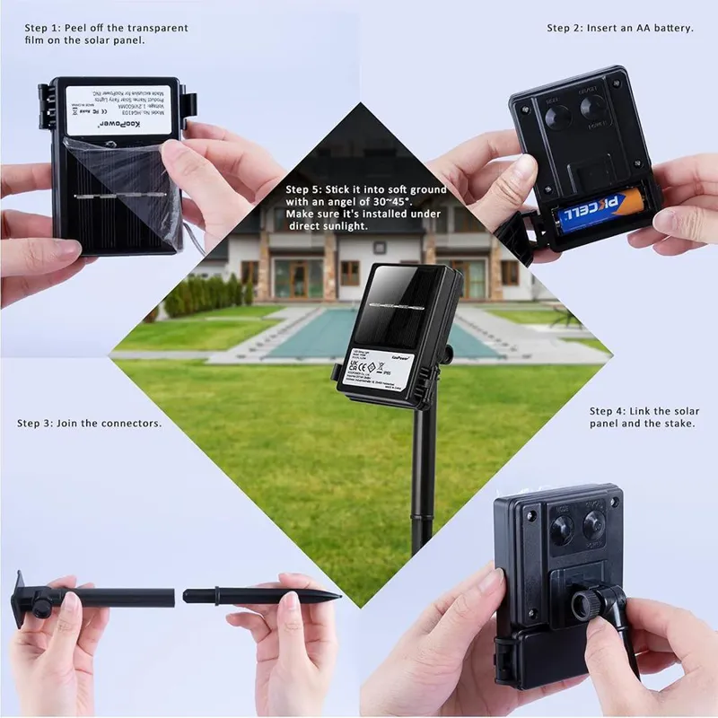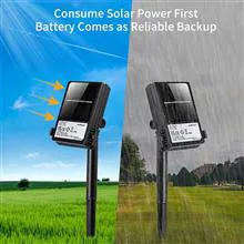 یک محفظه باتری (شامل باتری) در پشت پنل خورشیدی به این معنی است که رشته چراغ های خورشیدی یک راه حل عالی برای آب و هوای غیرقابل پیش بینی ارائه می دهد و به نور اجازه می دهد تا به طور معمول در روزهای آفتابی یا ابری، در داخل خانه یا داخل خانه کار کند.