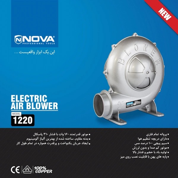 دمنده برقی 2 اینچ 160 وات نووا مدل 1220، ابزاری کوچک اما قدرتمند برای ایجاد جریان هوای یکنواخت و پرقدرت در کاربردهای خانگی و صنعتی است. این دستگاه با موتور 160 وات و فشار 310 پاسکال، قادر به تولید باد با حجم و فشار بالا بوده و در مواردی مانند تهویه فضا، خنکسازی تجهیزات، هدایت باد و بو در رستورانها، روشن کردن آتش در کورهها و گردش هوا در تأسیسات بسیار کارآمد است. بدنه مقاوم ساختهشده از آلیاژ آلومینیوم باکیفیت و پروانه تمام فلزی، دوام و عملکرد قابل اعتماد این دمنده را تضمین میکند.