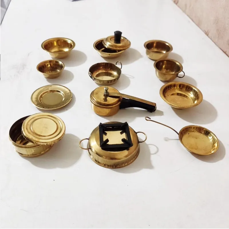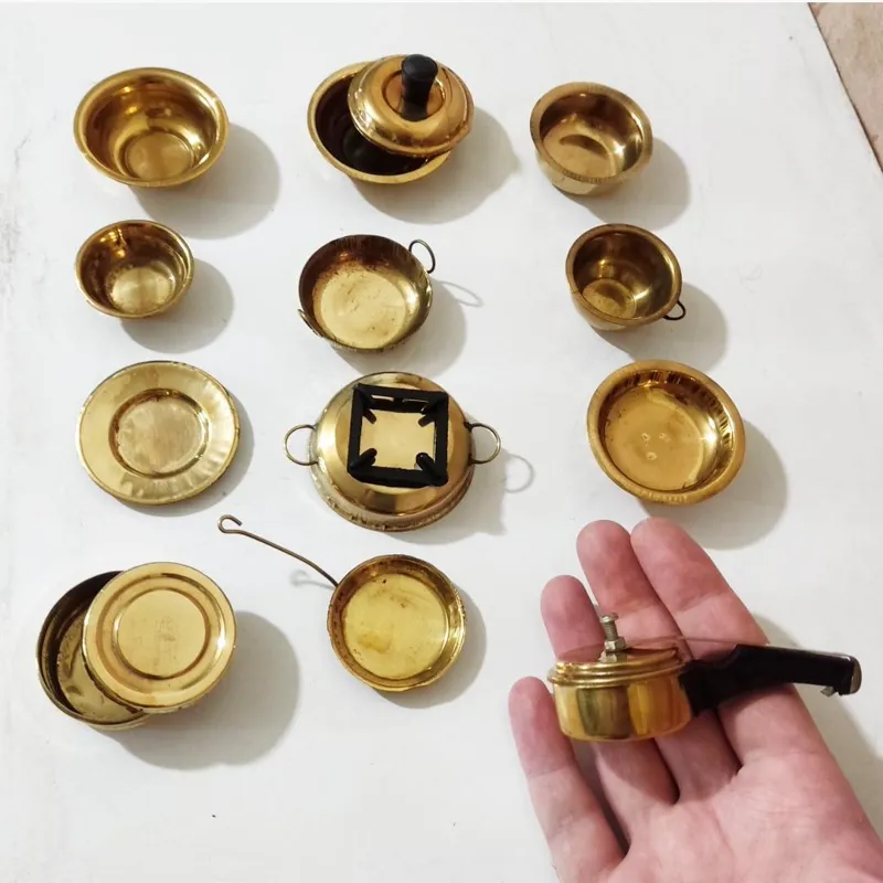 ست ظروف 12 عددی تمام برنجی مینیاتوری کوچک ساخت هندوستان با سطح کیفیتی درجه یک تزیینی دکوری بسیار زیبا و قابل شستشو بدون تغییر رنگ