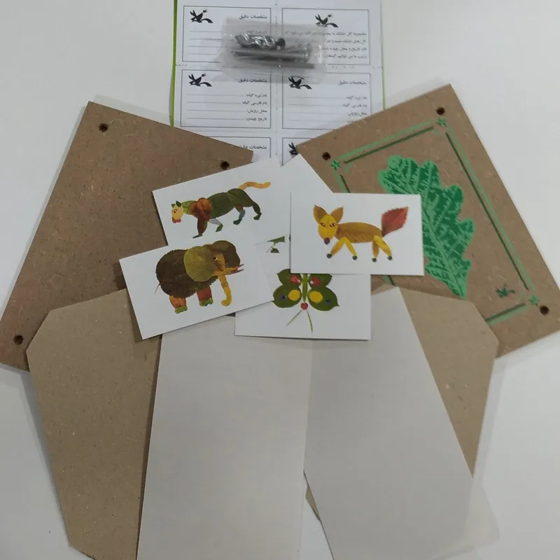 شامل: دو عدد تخته چوبی، دو عدد مقوای ضخیم، دو عدد کاغذ خشککن، چهار عدد پیچ و مهره فلزی، فرمهای ثبت مشخصات گیاهان، بروشور و 5 عدد کارت نمونه