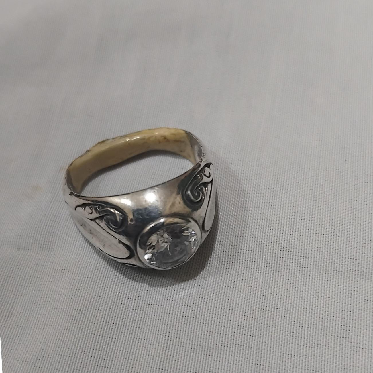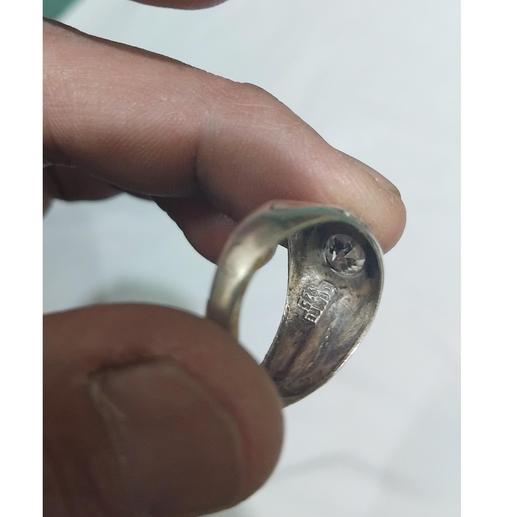 انگشترکهنه وقدیمی هست جنسش هم از نقره خالص 925عیارساخته شده وحدودا 30 سال پیش بهم رسیده بود، بسیارزیباوخوشرکاب هست وبعلت اینکه ازانگشتم سرمیخوردقسمت پایین روباچسب دوجزعی یکم زخیم کردم که ازانگشتم درنیاد