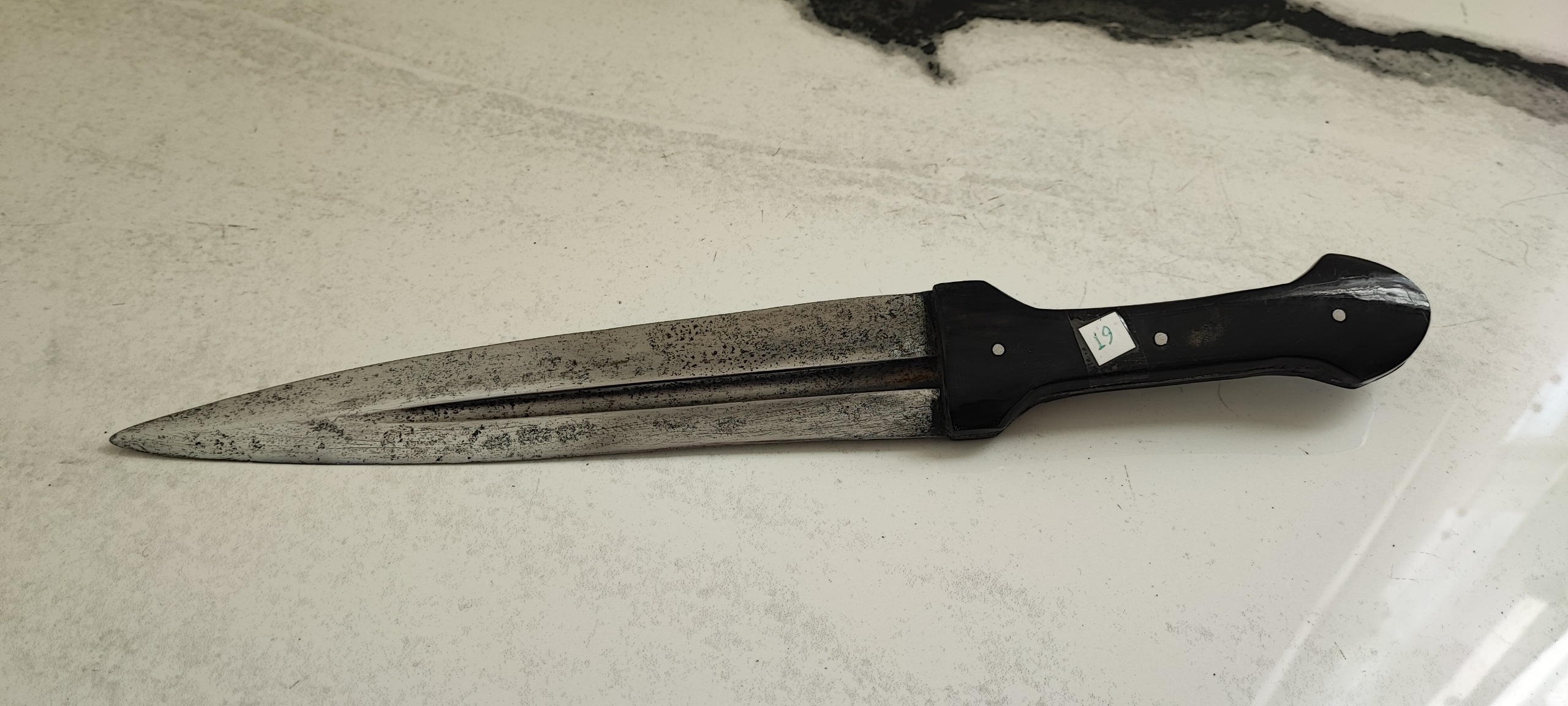 41 سانت طول، 49 میلیمتر پهنای تیغ، 390 گرم وزن، دسته شاخ و تیغ فولادی، بکر هست و فقط دسته تعویض شده، کمیاب و کلکسیونی