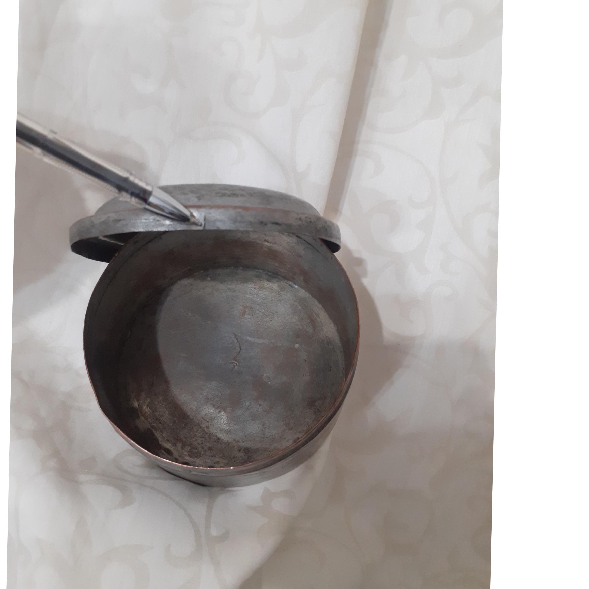 خریدار محترم این جعبه جواهراتی که به شکل قابلمه ای مانند درست شده به صورت خیلی حرفه ای یک تیکه درست شده بسیار کم یاب هستش بیش از 100 سال قدمت داره مال دوره رضا شاه پهلوی هستش