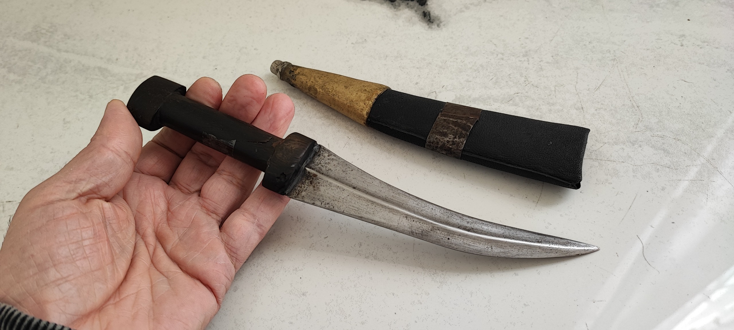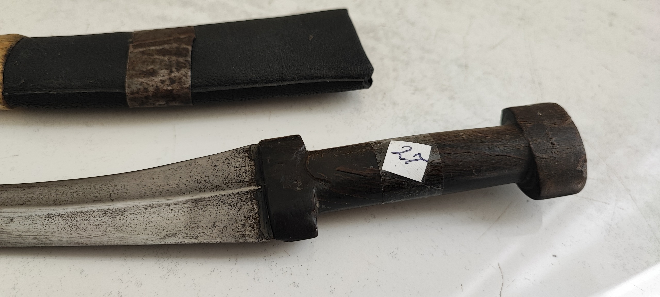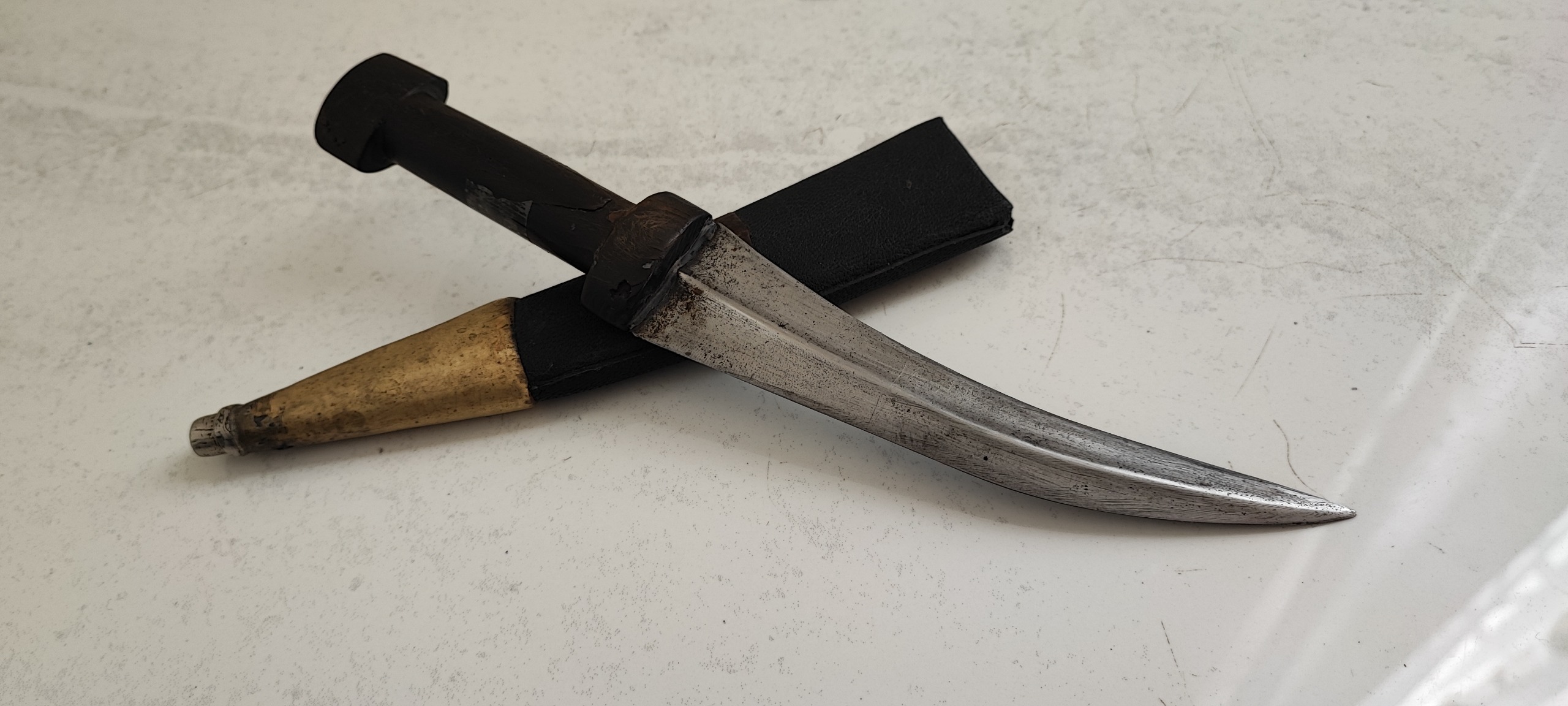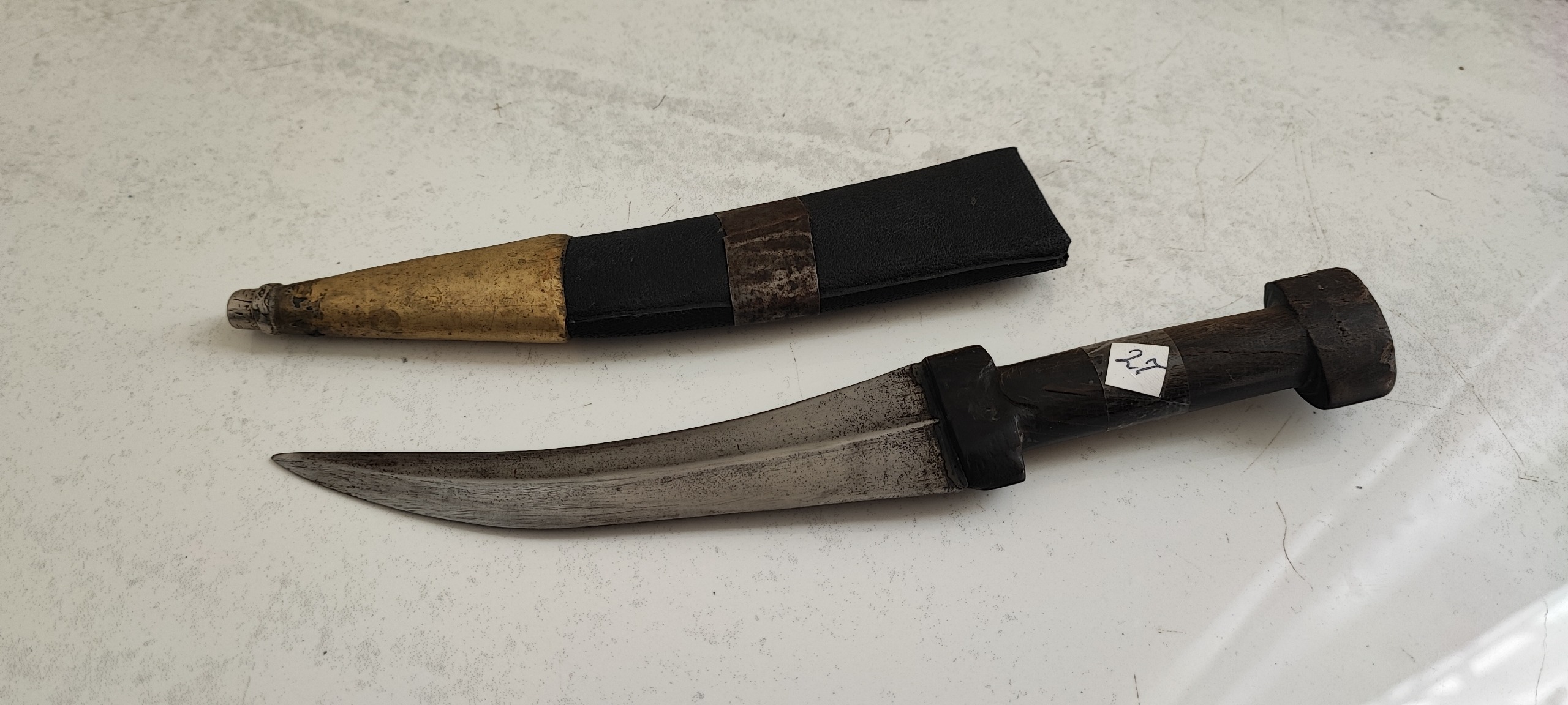 24/5 سانت طول، تیغ فولادی و دسته شاخ، و غلاف چوبی روکش چرم، نفیس و کمیاب و کلکسیونی