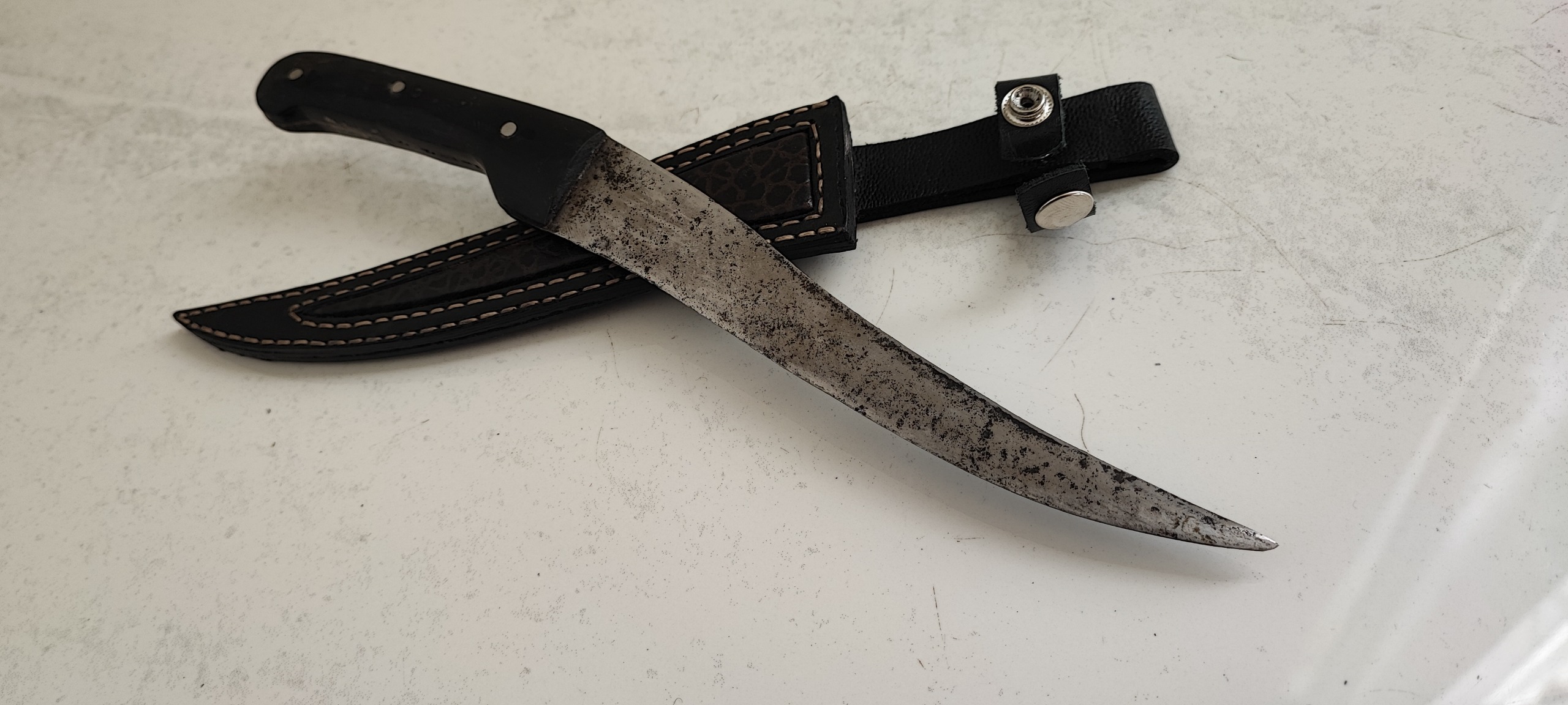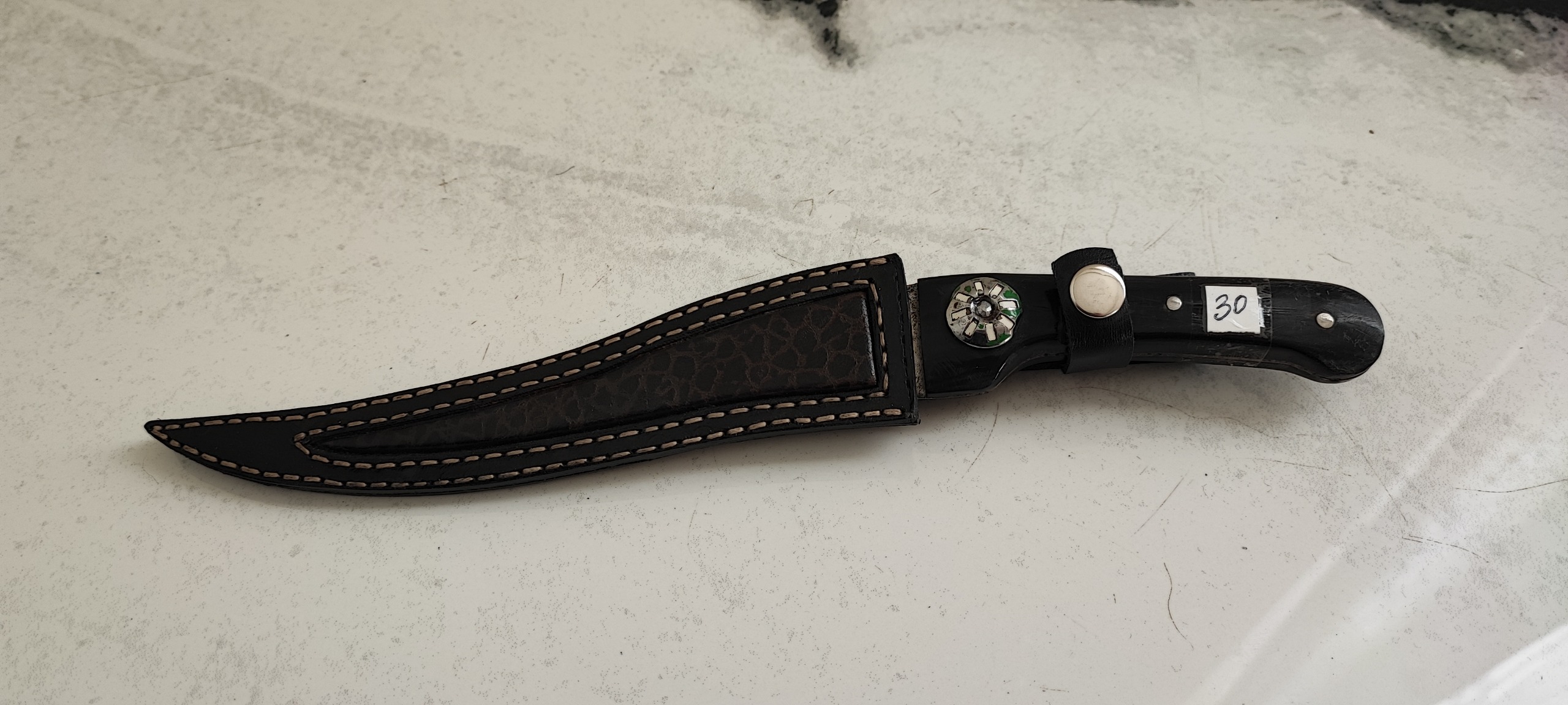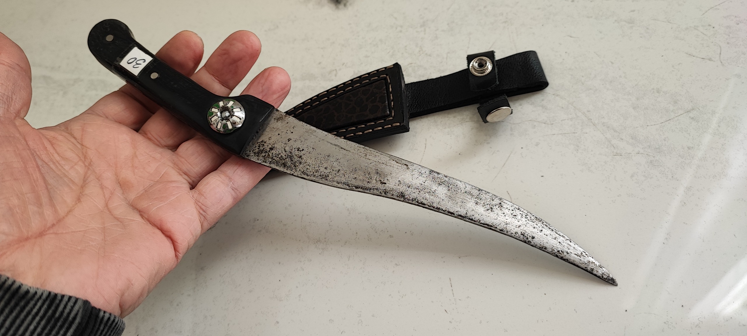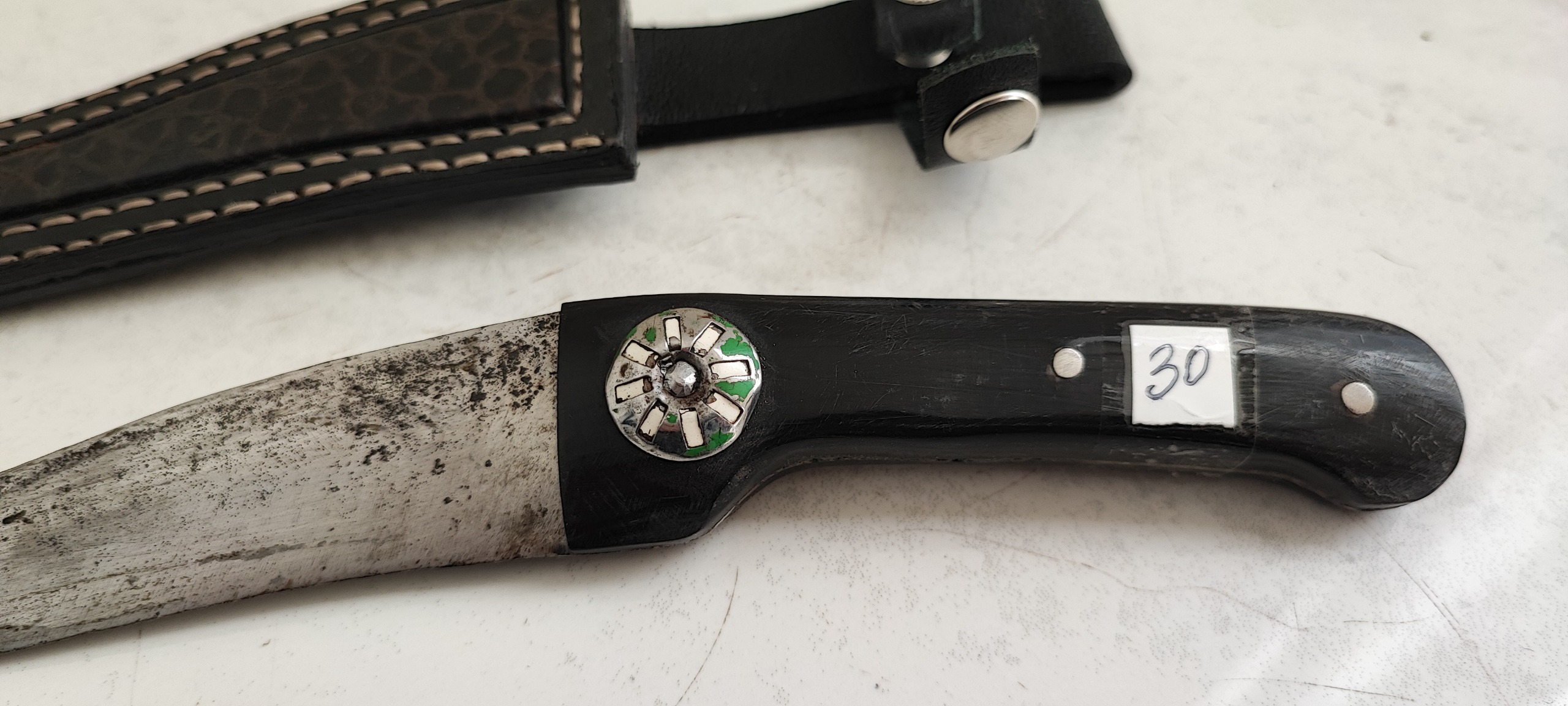 28 سانت طول، تیغ فولادی و دسته شاخ، و غلاف زیبای چرمی، نفیس و کمیاب و کلکسیونی