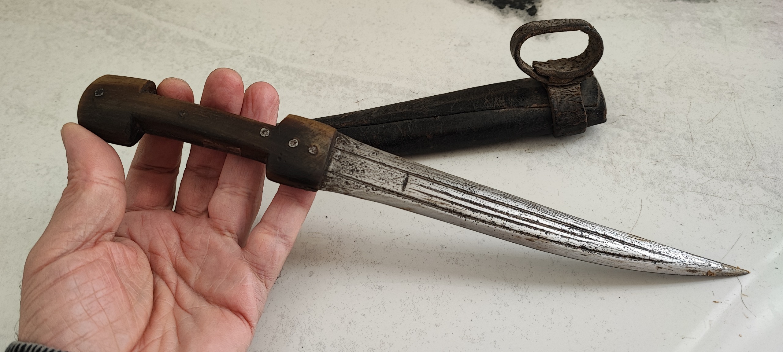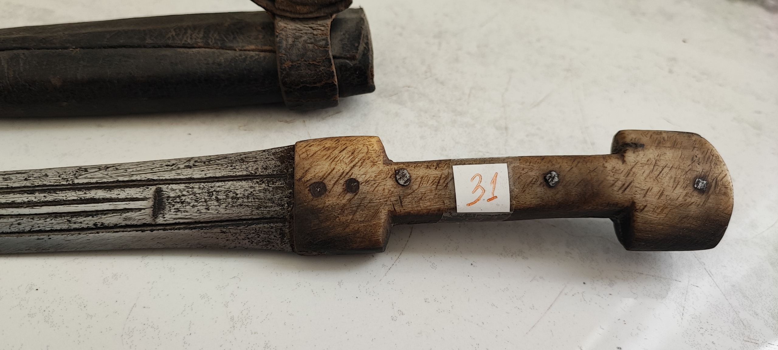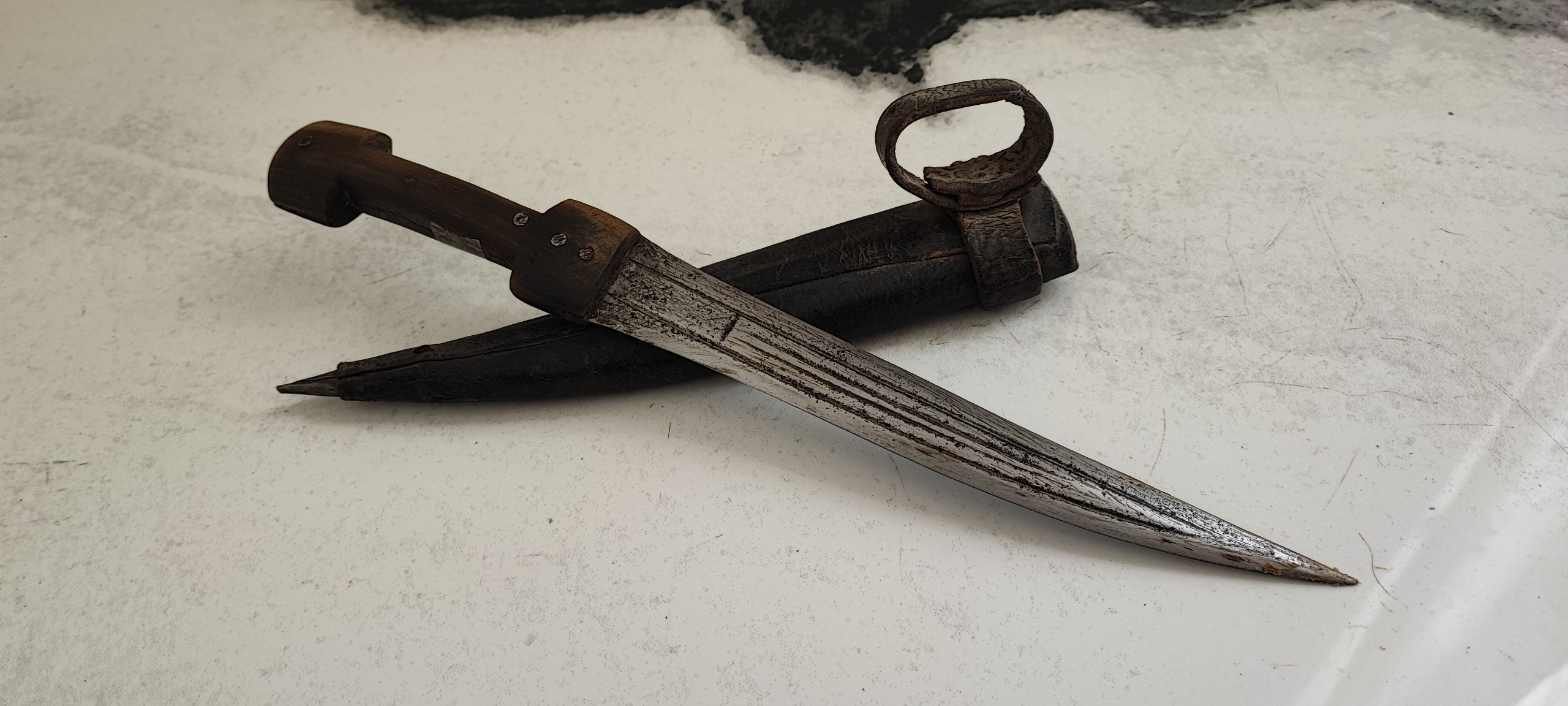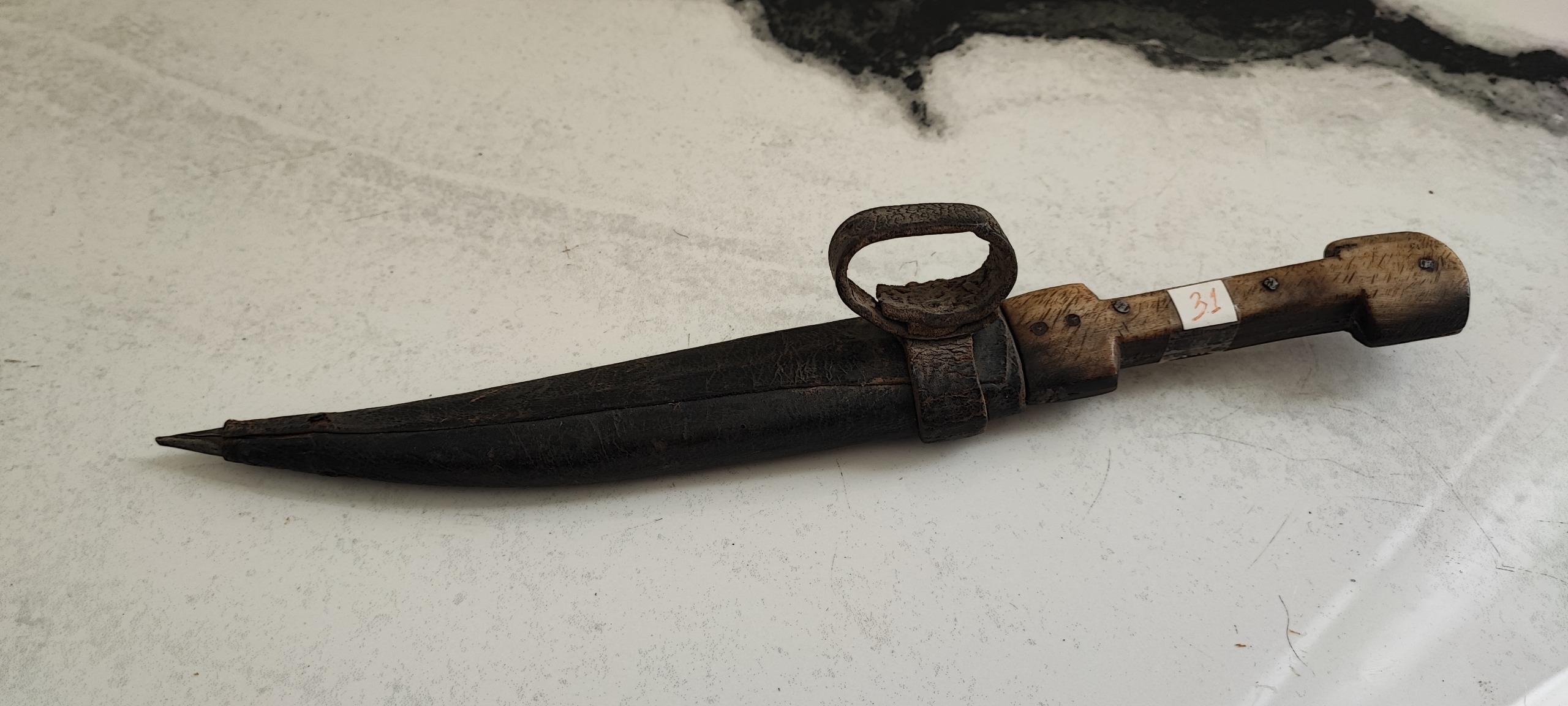 31/5 سانت طول، تیغ فولادی و دسته شاخ فابریک، و غلاف چوبی روکش چرم، نفیس و نایاب و کمیاب و کلکسیونی