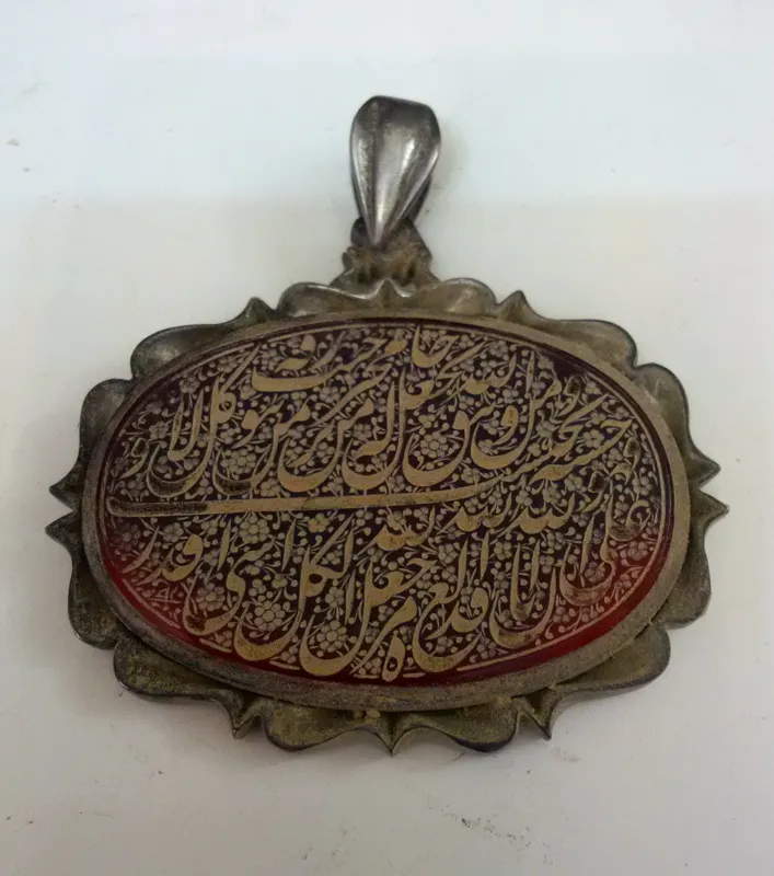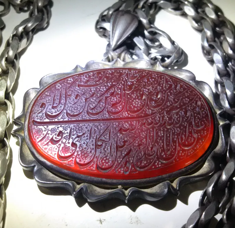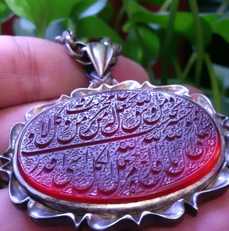 گردنی بسیار زیبای عقیق سرخ... مزین به آیه ( و من یتق الله...) بسیار زیبا و با انرژی خوب و برای رزق و روزی...خط نستعلیق ممتاز و بسیار زیبا..بدون کوچکترین ایراد..تذهیب عالی...ترکیب و کرسی بندی زیبا..