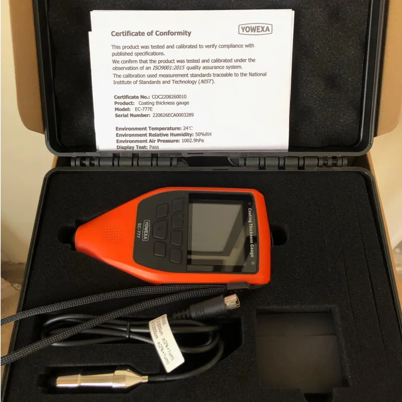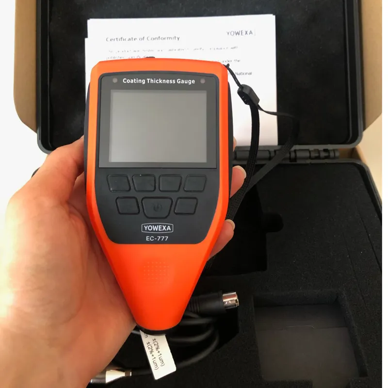 سنسور ضخامت سنج رنگ EC777E جدا و بر روی آهن و آلومینیوم تا 2000 میکرون با درصد یک میکرون ضخامت رنگ و لعاب را نمایش میدهد . ضریب خطا ضخامت سنج رنگ EC777E فقط ±(2%+1μm) میباشد و رزولیشن این دستگاه 0.1μm میکرون میباشد ضخامت سنج رنگ EC777E دارای صفحه نمایش بزرگ و رنگی و قابل چرخش دارد