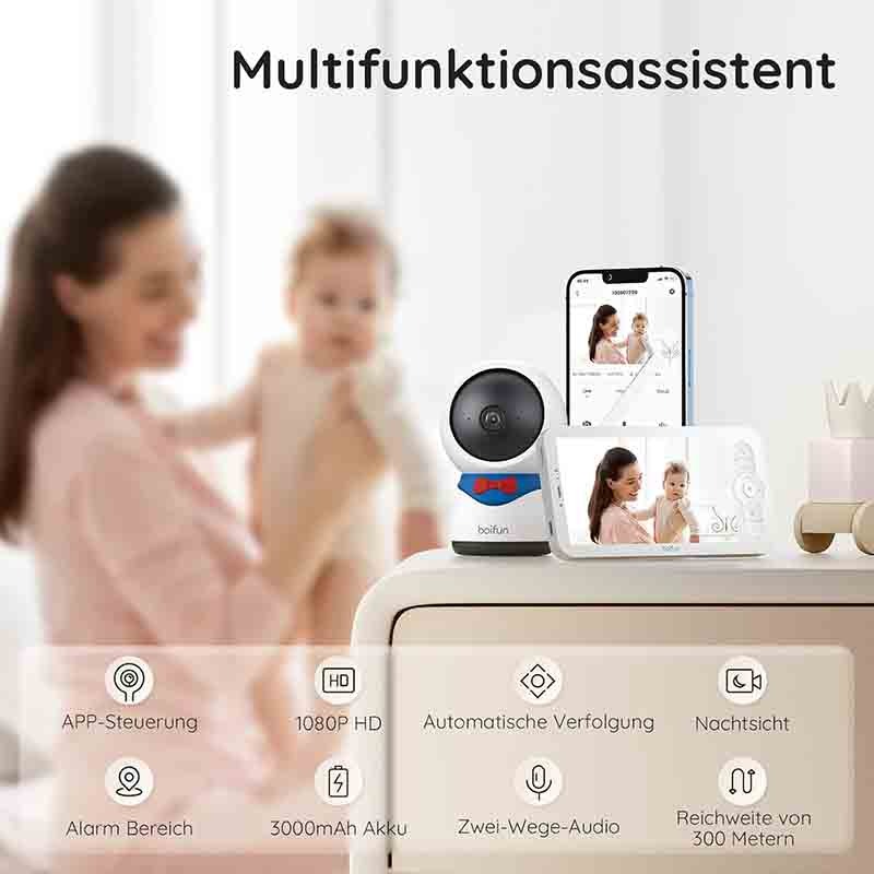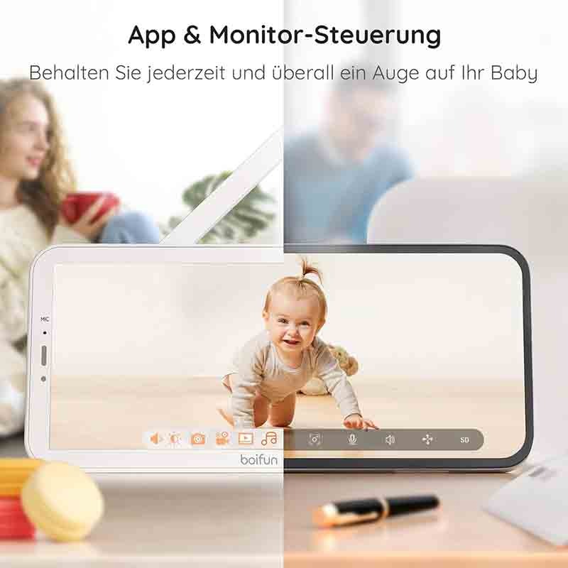 مانیتور کودک BOIFUN به دوربین همراه، هم از اتصال مانیتور LCD 5 اینچی (تا برد 300 متر) و هم از اتصال با اپلیکیشن موبایل (نیازمند WiFi) پشتیبانی میکند. میتوان در حین لذت بردن از اوقات فراغت، مراقب کودک نوپای خود باشید.