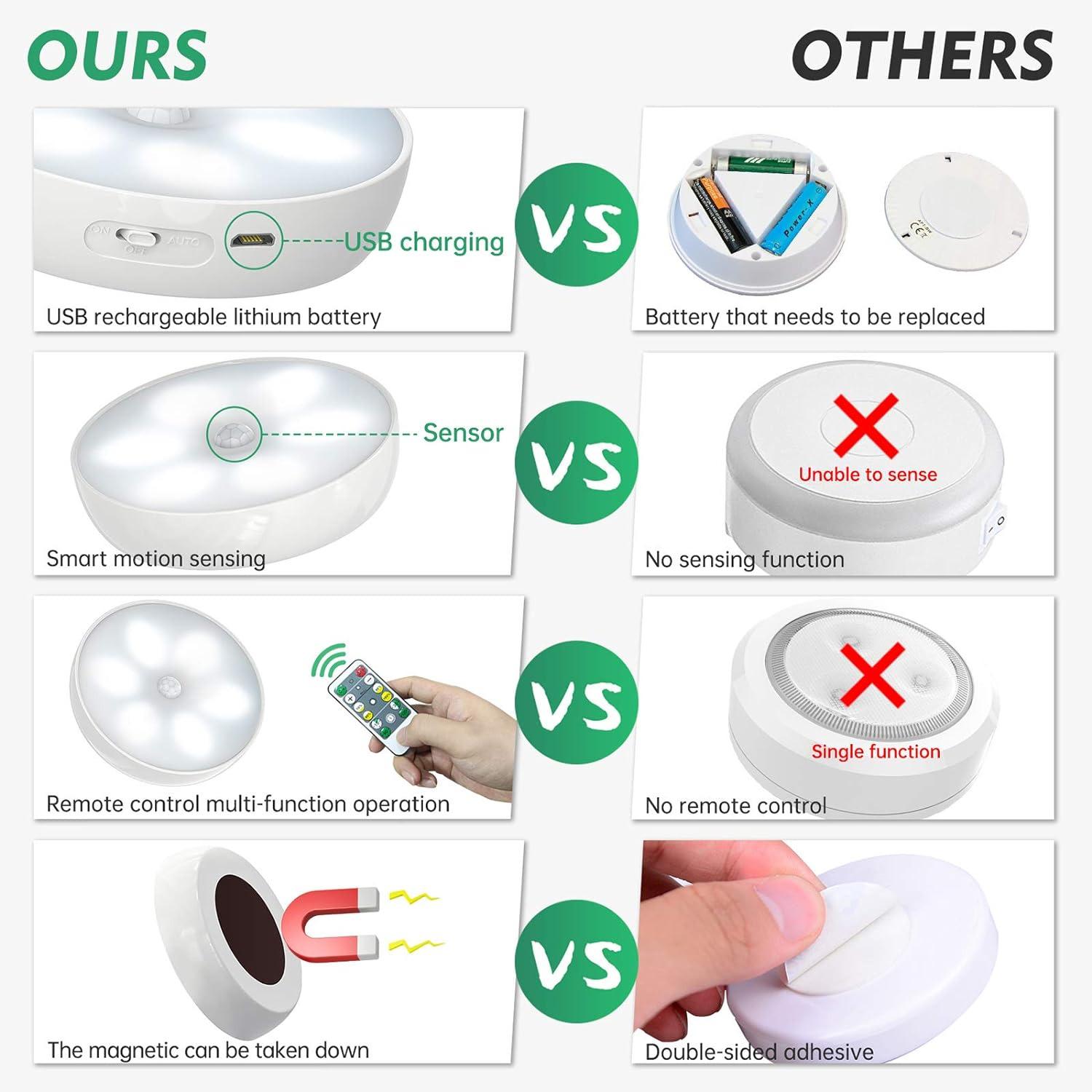 (دارای کم نور و زمان بندی) چراغ کابینت دارای یک کنترل از راه دور است. فقط در حالت روشن، چراغ همیشه روشن می شود و می توان با کنترل از راه دور از آن استفاده کرد. 4 سطح روشنایی: 10٪، 40٪، 80٪، 100٪. و با فشار دادن دکمه +/- برای افزایش/کاهش روشنایی با کنترل از راه دور، کم نور کردن بدون پله را انجام دهید. چراغ به طور خودکار پس از 10، 30، 60 یا 120 دقیقه با عملکرد زمان بندی خاموش می شود. چراغ های شب LED مراقبت گرم بیشتری را برای خانواده شما در هنگام حرکت در تاریکی به ارمغان می آورد.