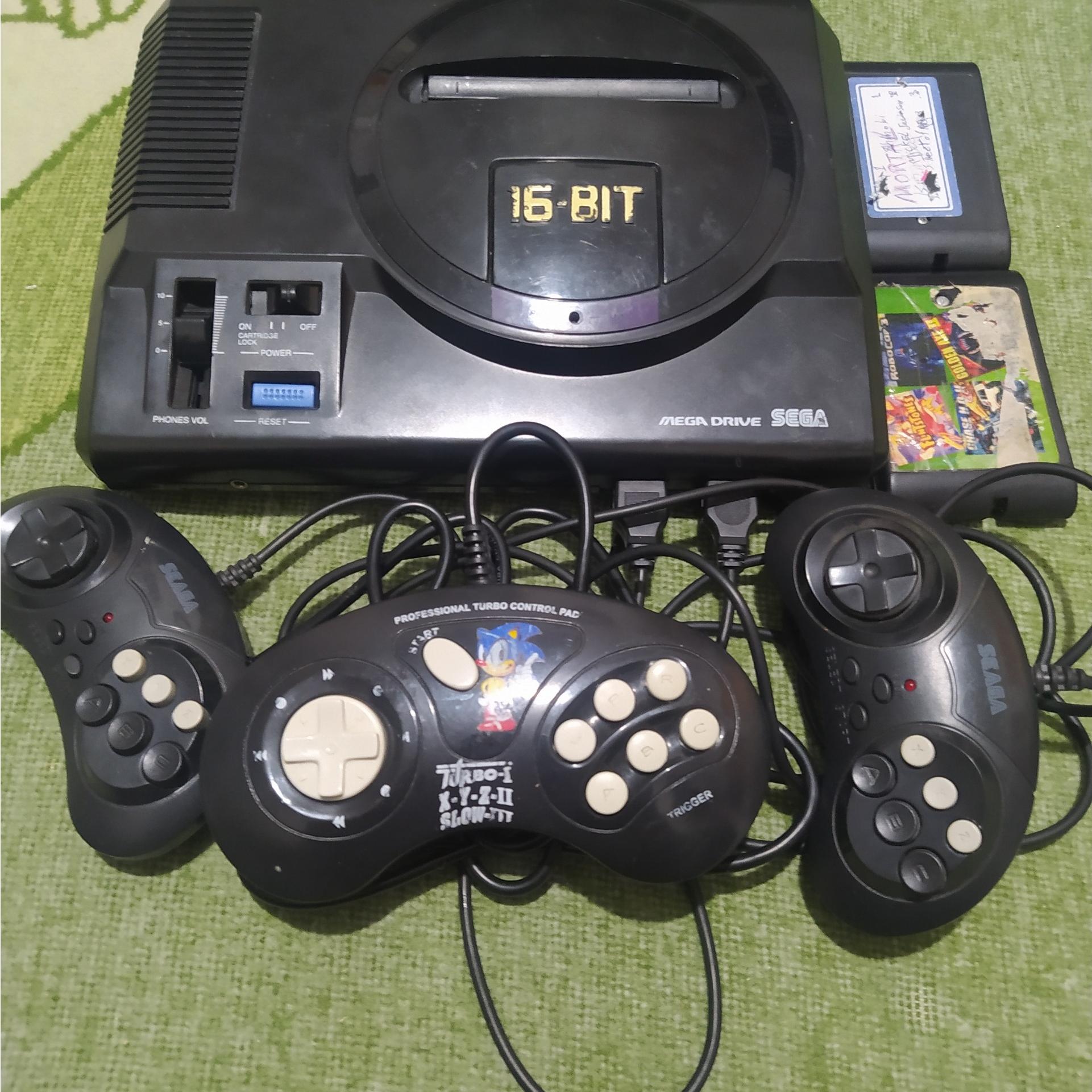 سگا مگا درایو بادو دسته سالم و آداپتور برق و فیش تصویر و دو عدد کارتریج بازی تک لبه مورتال کمبت و چهار لبه گلدن اکس وعصر حجر و ربوکاپ و ماشین میباشد فقط دسته بازی بزرگ سونیک معیوب میباشد ولی دو عدد دسته کوچک بدون ایرا د میباشد طبق تصویر ارسال خواهد شد