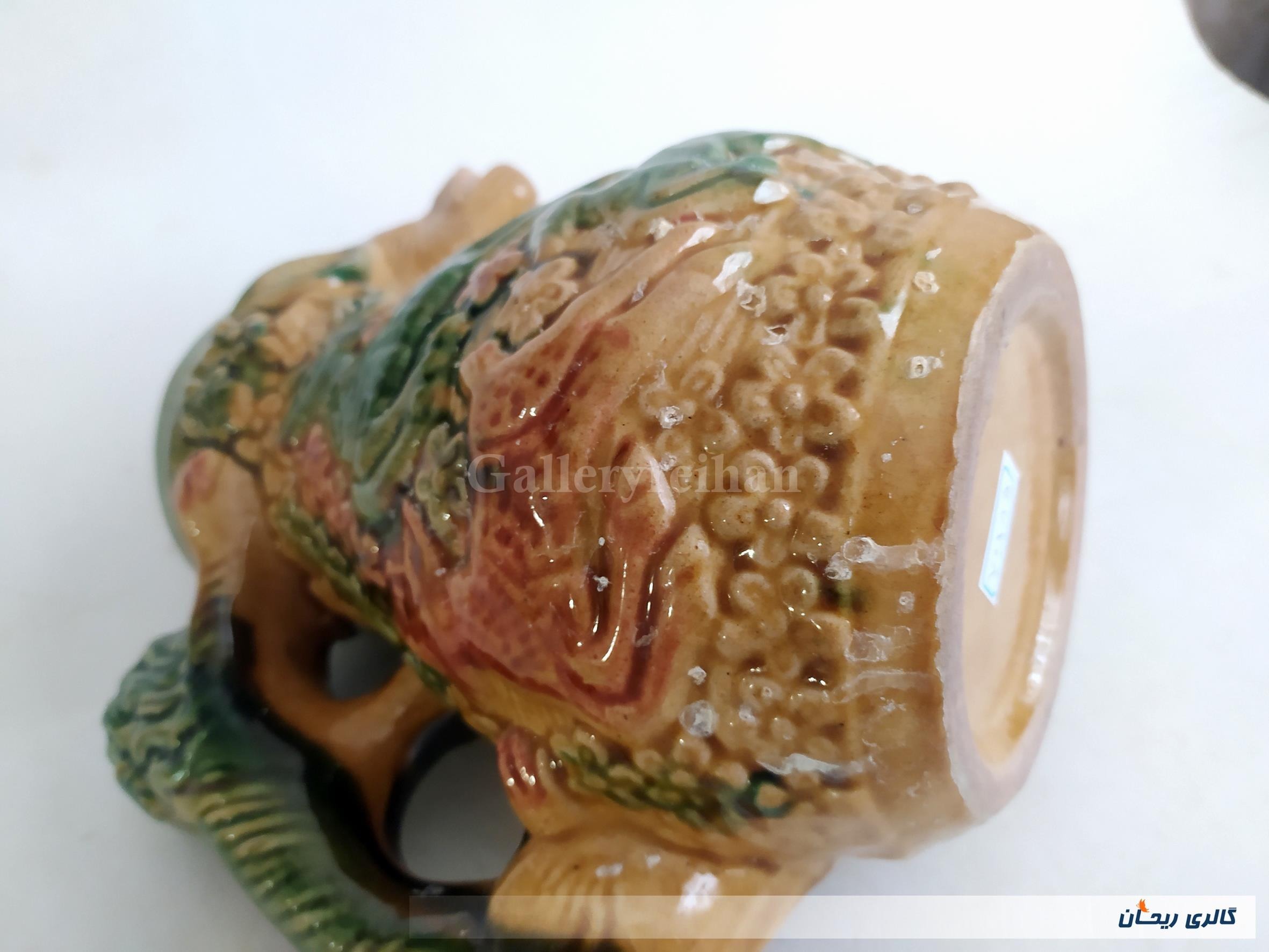طبق تصاویر در قسمت پایین پارچ در حد کم لعاب پوست پوست شده و قیمت هم بر همین اساس قرار داده شده است .
