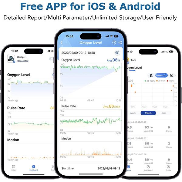 (به طور ویژه برای خواب O2 طراحی شده است): به طور مداوم سطح 02، ضربان قلب، تعداد دفعاتی که سطح O2 بیش از 4 درصد کاهش می یابد، روند یک شبه سطح 02 و حرکت بدن را در هر 4 ثانیه ثبت می کند.