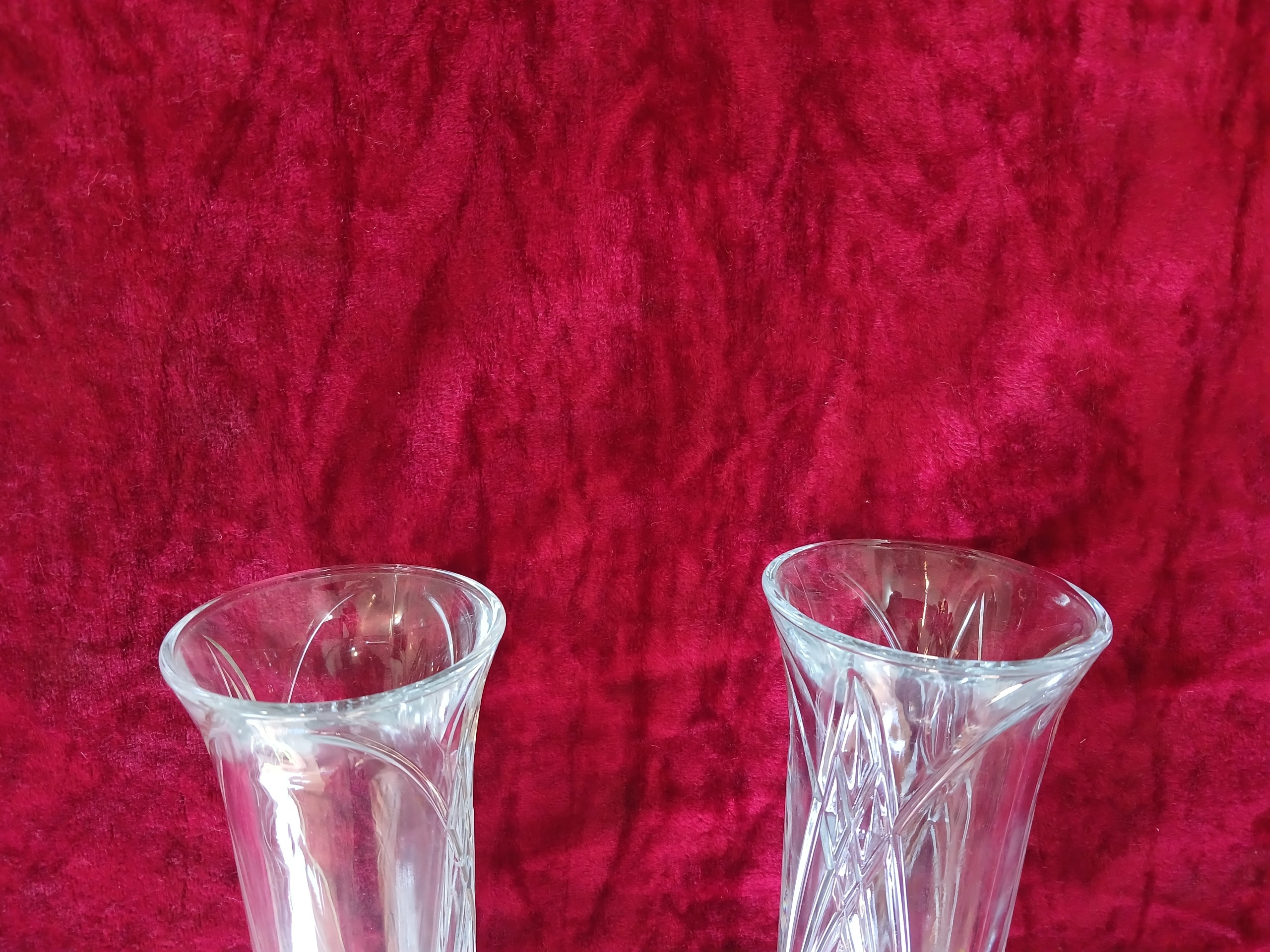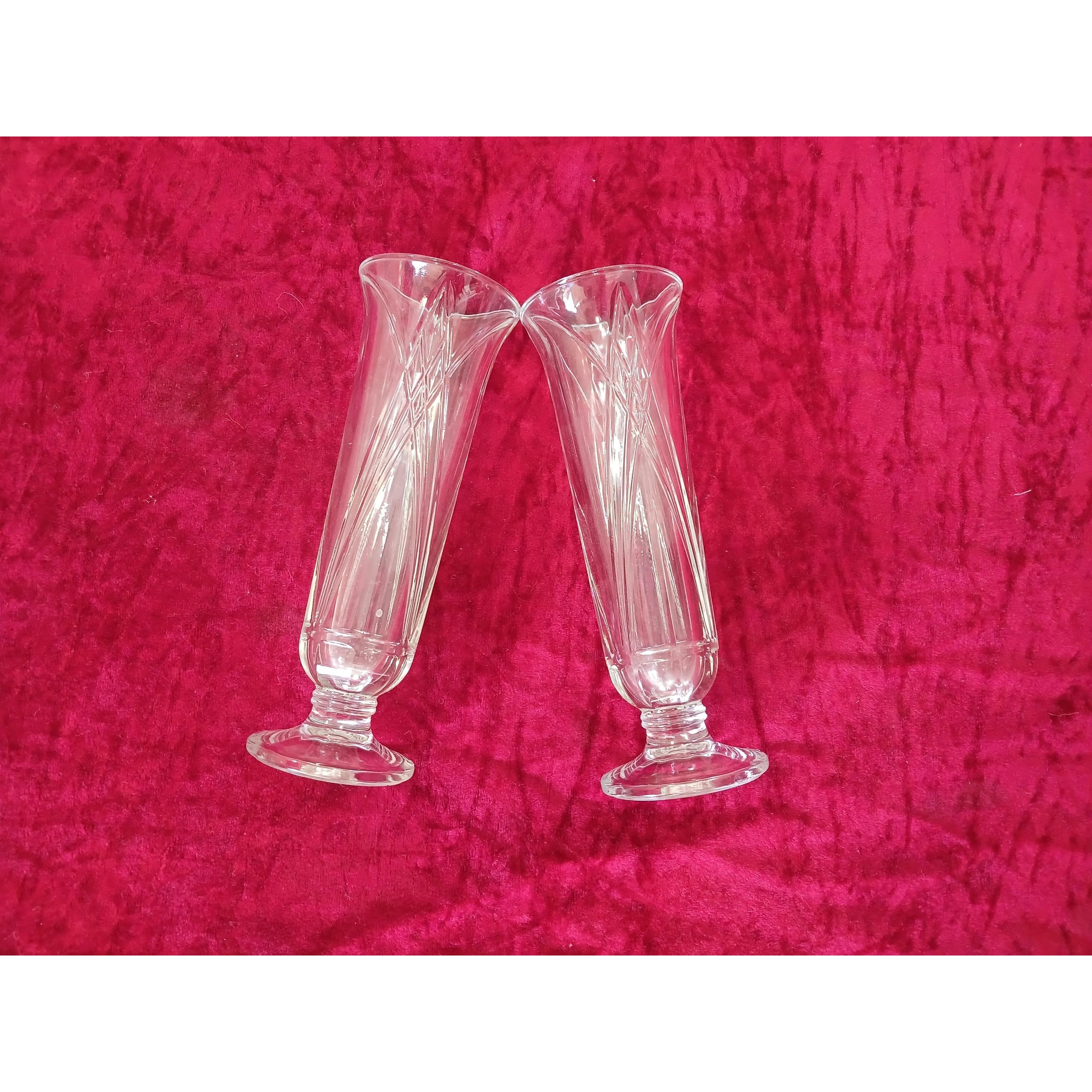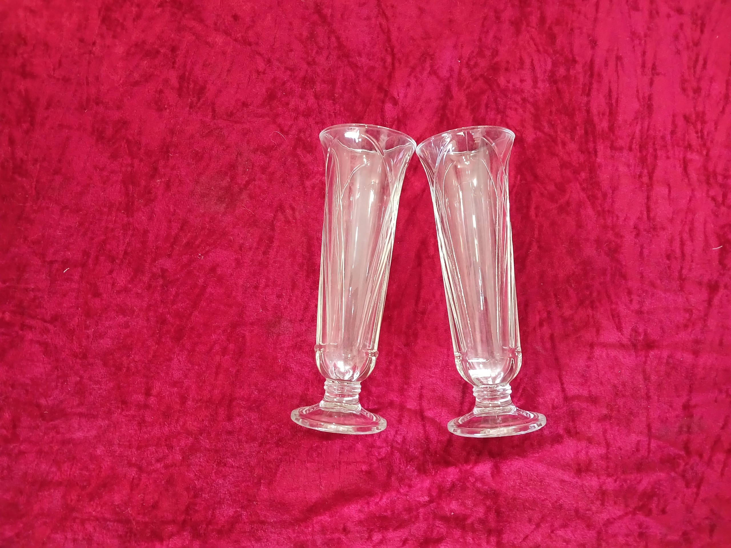 جفت گلدان شیشه ای سالم و بدون ایراد کیفیت یک خیلی تمیز مونده در حد نو بدون هیچ گونه ایراد و لب پریدگی اندازه (ارتفاع) 20 سانت و قطر پایه که روی زمین مینشیند 6/5 سانت و قطر دهانه 7 سانت.