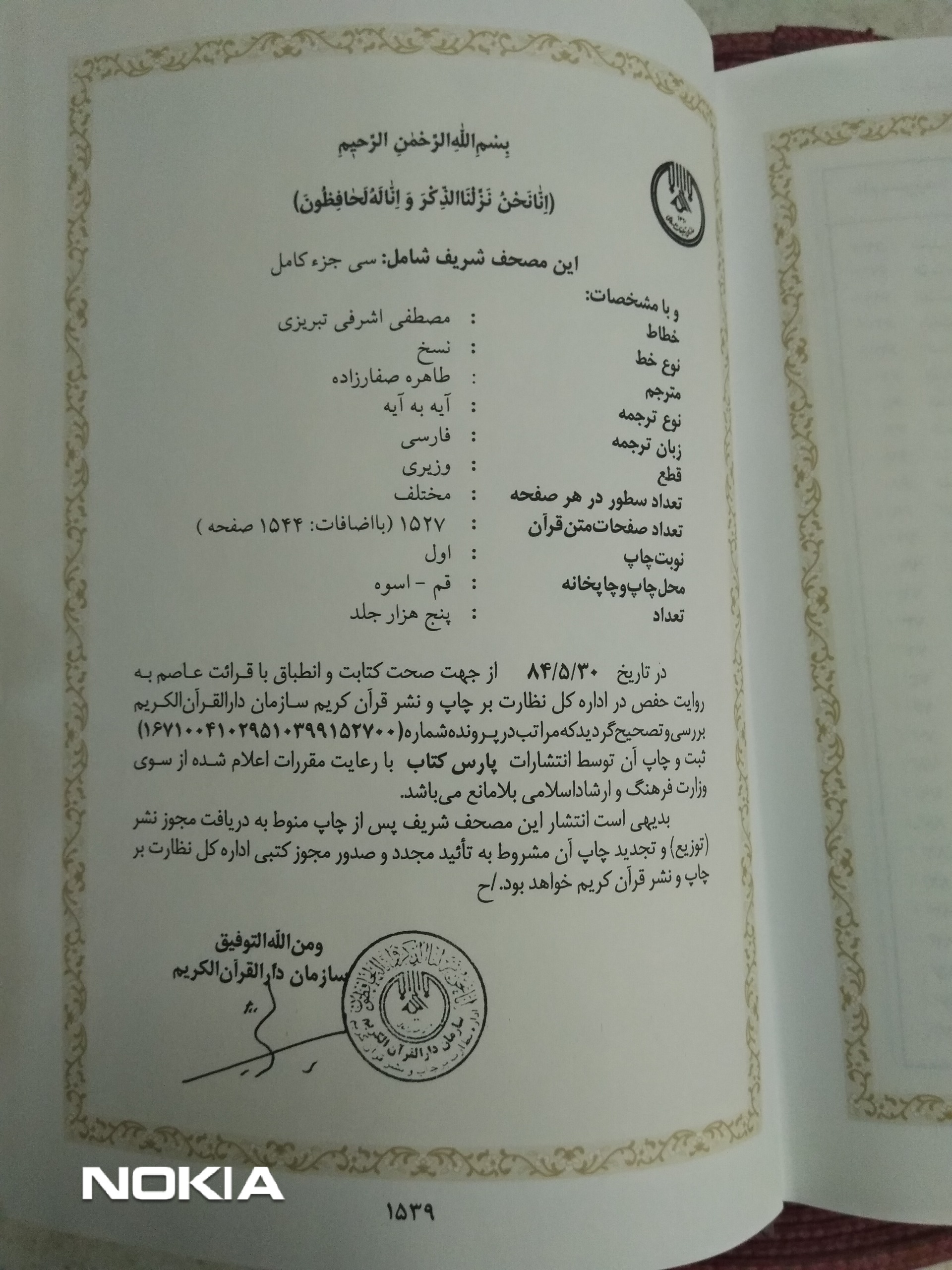 کتاب نفیس قرآن حکیم ترجمه بانو طاهره صفارزاده دین پژوه نامدار کشور با کیفیت عالی.چاپ توسط انتشارات پارس کتاب نوبت اول در 1544 صفحه به قیمت مناسب تقدیم به شما . تصاویر کتاب خدمت شما آورده شده است و با توجه به وزن کتاب که حدودا 2/400 میباشد خواهشمندم با دقت و توجه انتخاب فرمائید امکان برگشت ندارم . تندرست باشید.