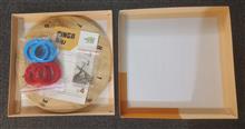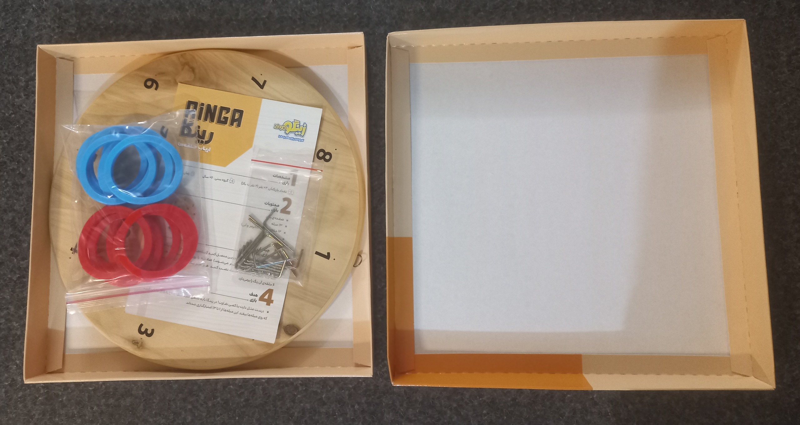 اقلام همراه 1 عدد تخته ی بازی 13 عدد میله 12 عدد حلقه در دورنگ (قرمز و آبی) 1 عدد بروشور بازی