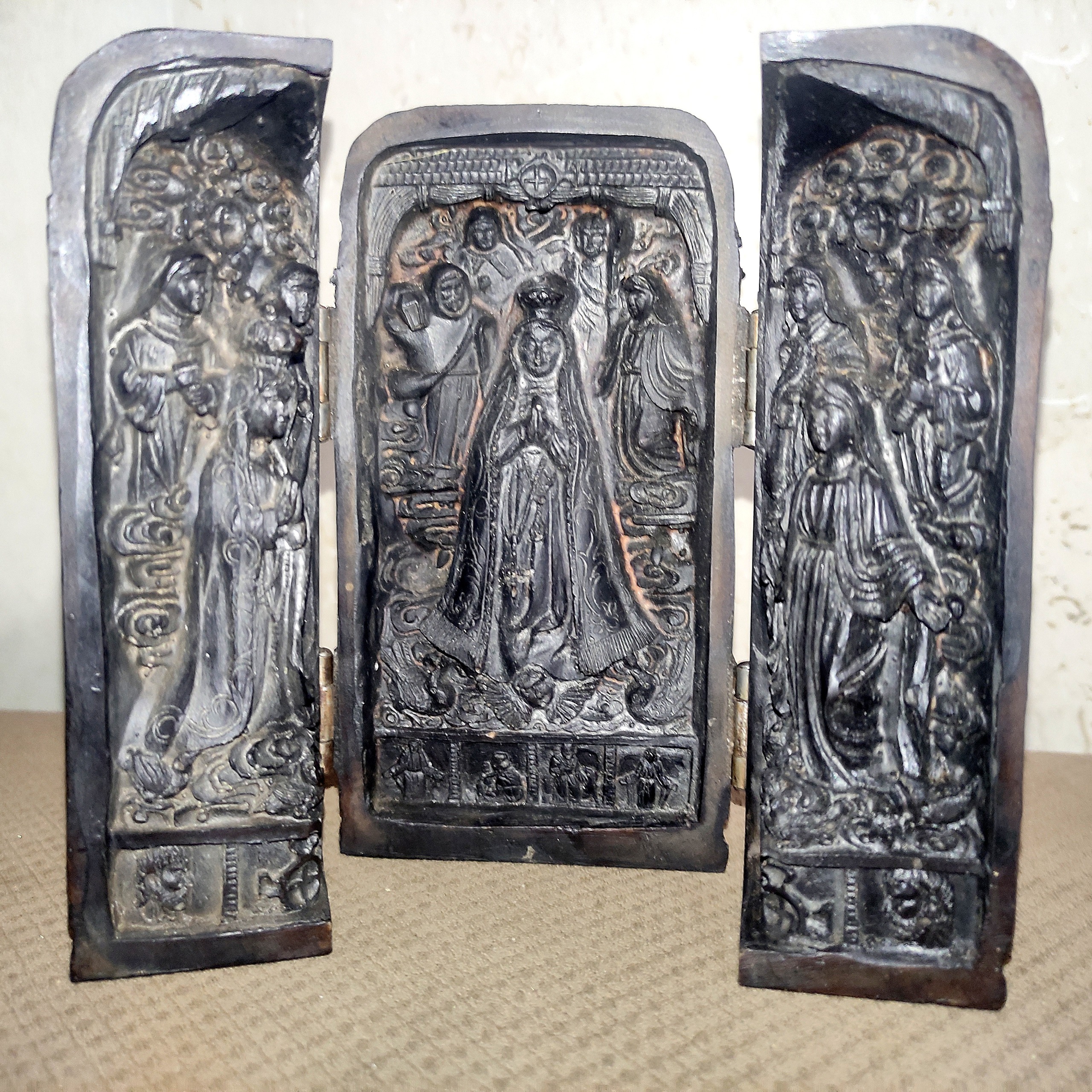 معبد کوچک و قابل حمل با درهای باز شونده کنده کاری روی چوب مصنوعی با موضوعات و اعتقادت مذهبی و کتیبه های رومی ، چین ، سلسله چینگ (1644-1912 )