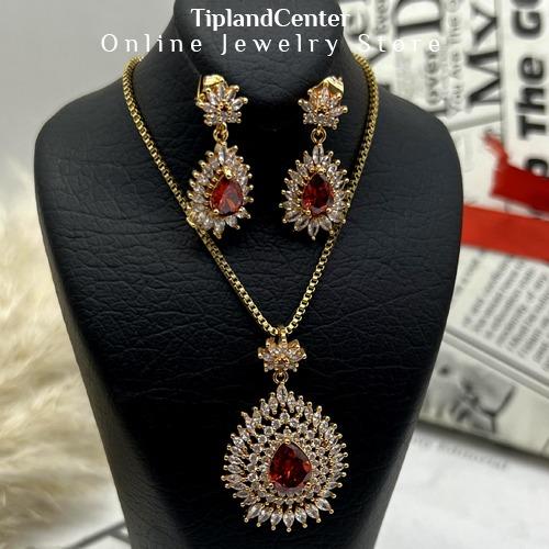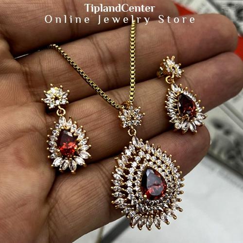 نیم ست نگین دار طرح زمرد بسیار شیک و زیبا با نگین قرمز رنگ و کاملا مشابه طلا یک ست فوق العاده برای درخشش در میهمانی ها و مجالس شما میباشد. این نیم ست نگین قرمز ساخته شده از استیل عیار 316 با بالاترین کیفیت آبکاری رنگ ثابت و ضد حساسیت میباشد. طول زنجیر 45 سانت و نگین های روی پلاک و گوشواره اتمی بدون ریزش که درخشندگی این ست را دو چندان نموده است.