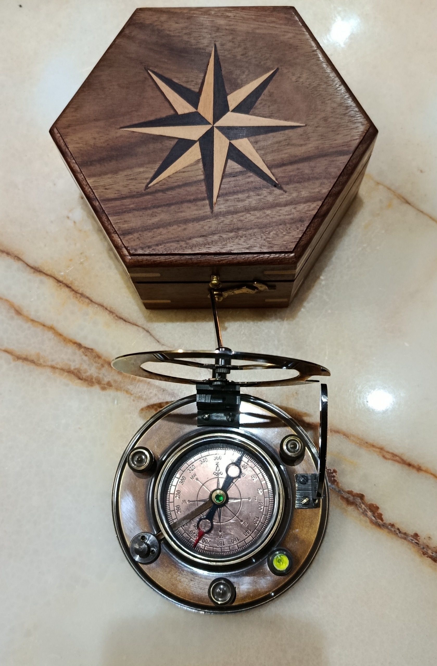 قطب نما و ساعت خورشیدی برنزی درجه یک فوق آنتیک و نایاب کلکسیونی مارک حک شده. همراه با جعبه چوبی.قطب نما باز شونده دارای اعداد و علائم رومی و ستاره شناسی.دارای پایه تنظیم شیب دارای قفل کن قطب نما و همچنین تراز شیب.
