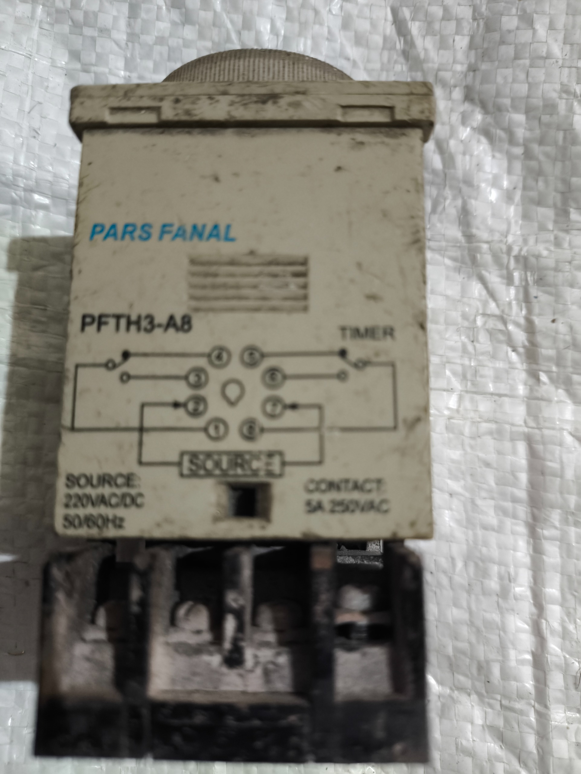این قطعه یک تایمر صنعتی 8 پایه از برند معتبر ایرانی پارس فانال است، مدل PFTH3-A8 با تغذیه 220 ولت AC/DC و خروجی 5 آمپر.
