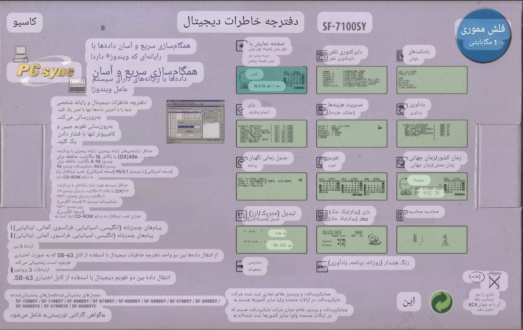 SF-7200SY یکی از بهترینهای کاسیو در تصویر عملکردها رو به فارسی ترجمه کردم-عکس از اینترنت دانلود شده خود دستگاه بسیار تمیزه تمایل به خرید داشتید ازش براتون عکس میفرستم،دستگاه کاملا سالم تمیز و بی عیبه ارزون دادنش دلیل بر ایرادی نیست،جهت نصب به کامپیوتر باید از کابل مدلSB-63استفاده کنید در صورت تمایل البته-دستگاه با جفت باتری نیم قلم کار میکنه که مدت زیادی می مونه جفت باتری نو همراه دستگاه می باشد،کالا طبق متن فوق هست یعنی تمیز و بی ایراد مرجوعی ندارد پس لطفا در خرید خود دقت کنید کالای فوق کمیاب و نادر است خصوصا در این رقمش یعنیsf7200sy سوالی داشتید پیام بذارید پاسخگو هستم
